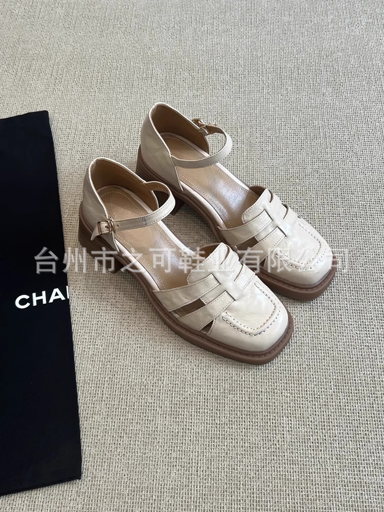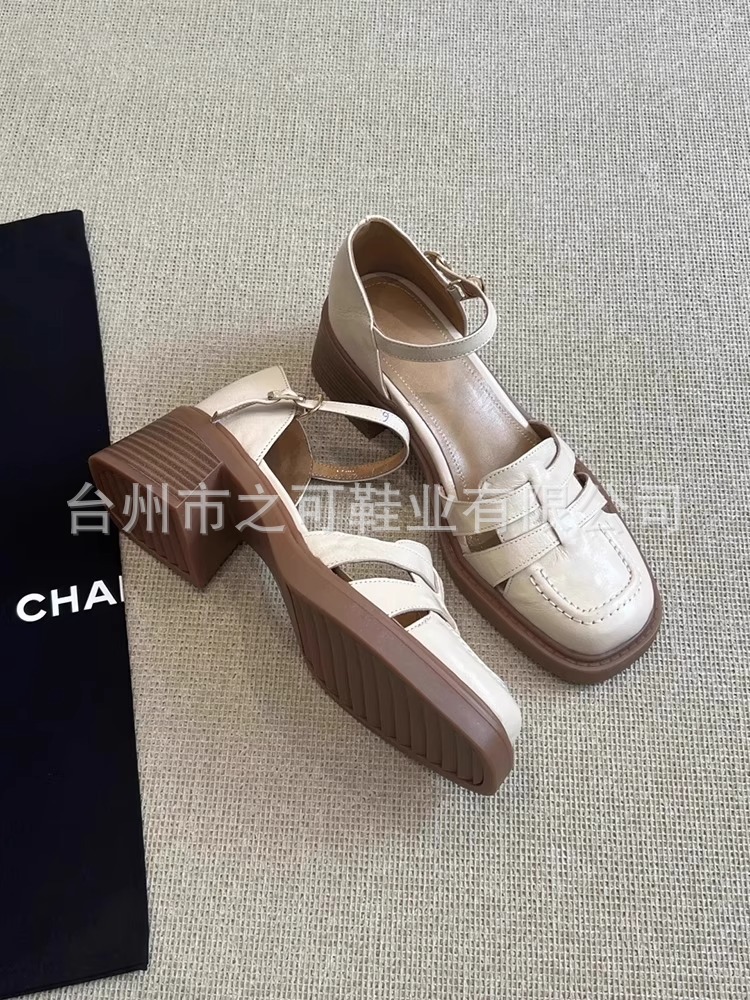 양가죽 버전의 복고풍 미색 로마 발가락 샌들, 프렌치 복고풍 여름 신상 여성용 두꺼운 굽 신발스토어 가기