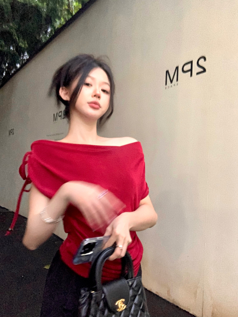 여성을위한 프랑스 스타일 레드 원 라인 칼라 반팔 티셔츠 여름 2025 새로운 짧은 슬림 피트 풀오버 탑스토어 가기