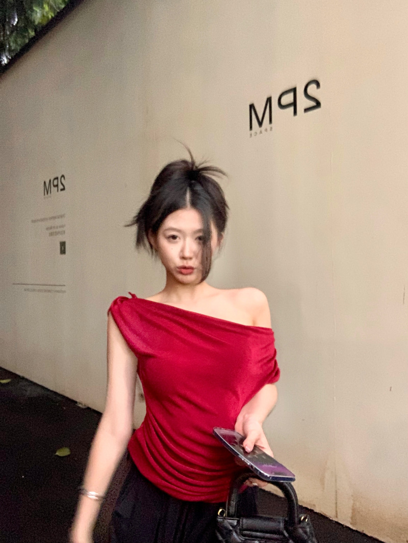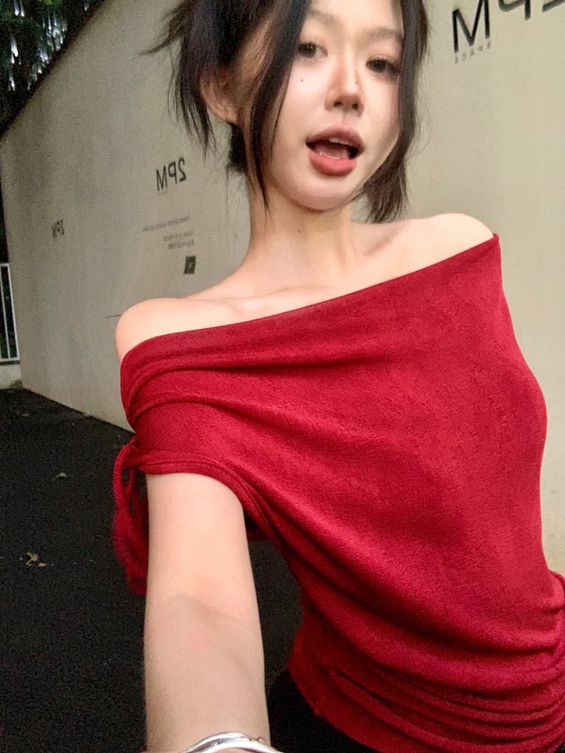 여성을위한 프랑스 스타일 레드 원 라인 칼라 반팔 티셔츠 여름 2025 새로운 짧은 슬림 피트 풀오버 탑