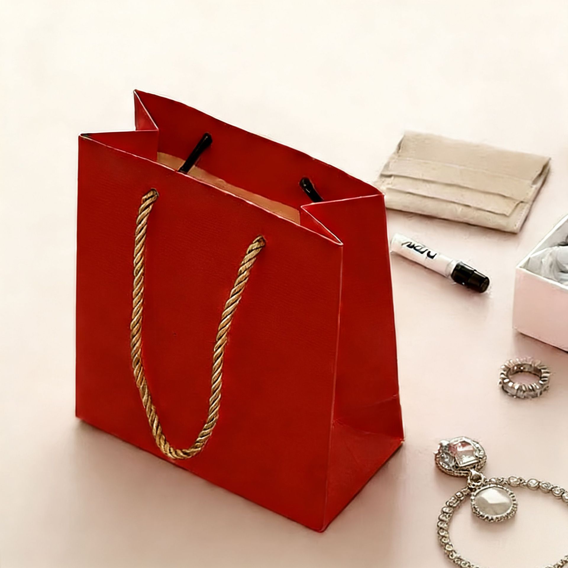 • 진한 빨강색 엠보싱 코팅; 230g 백색 카드지 15*14*7cm