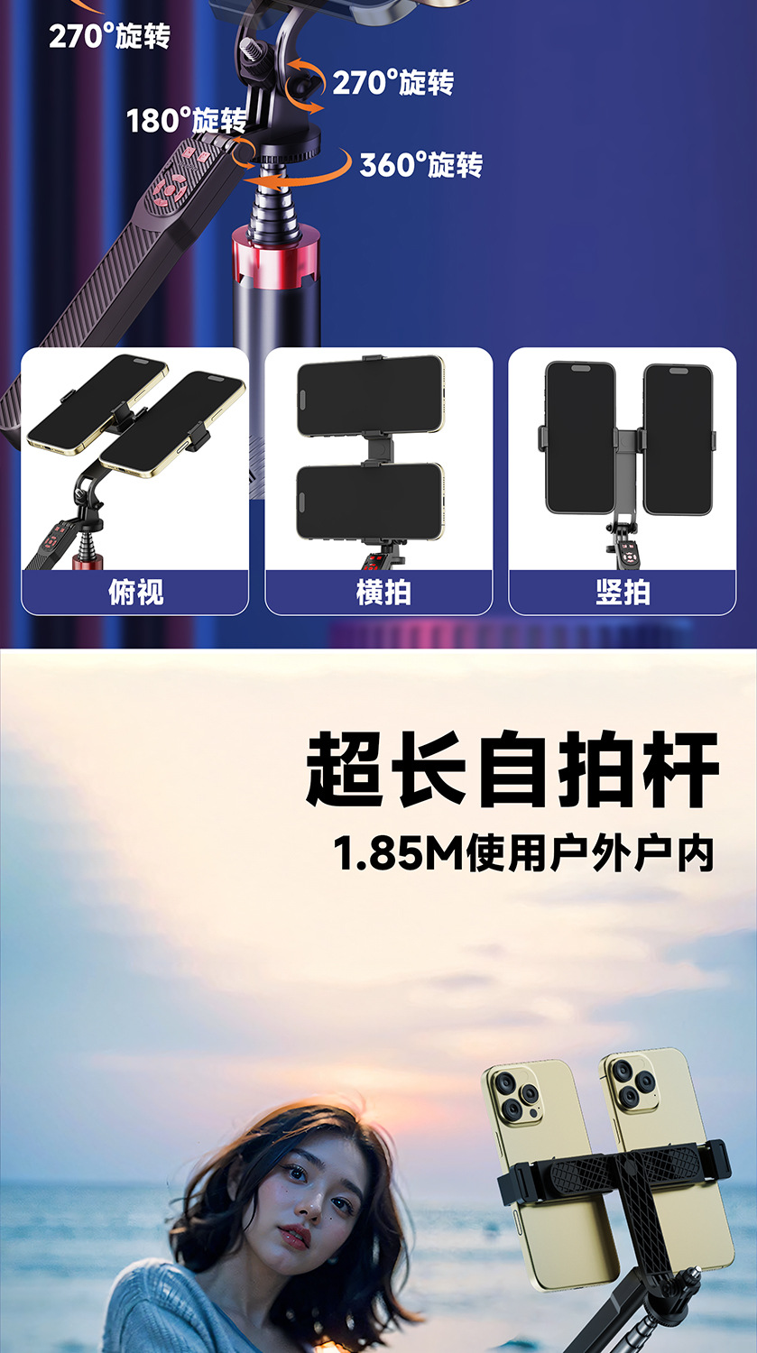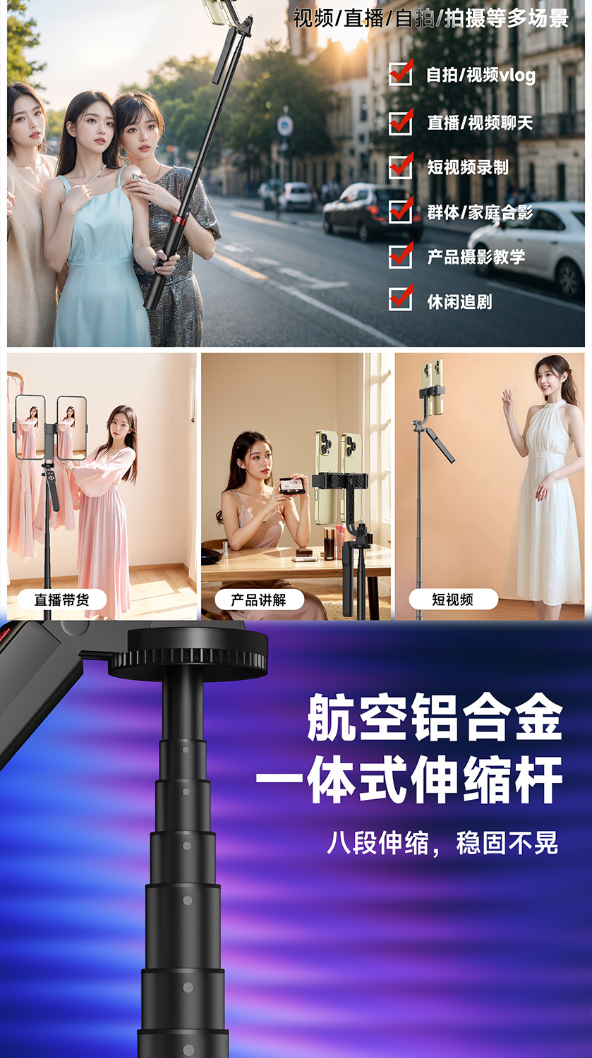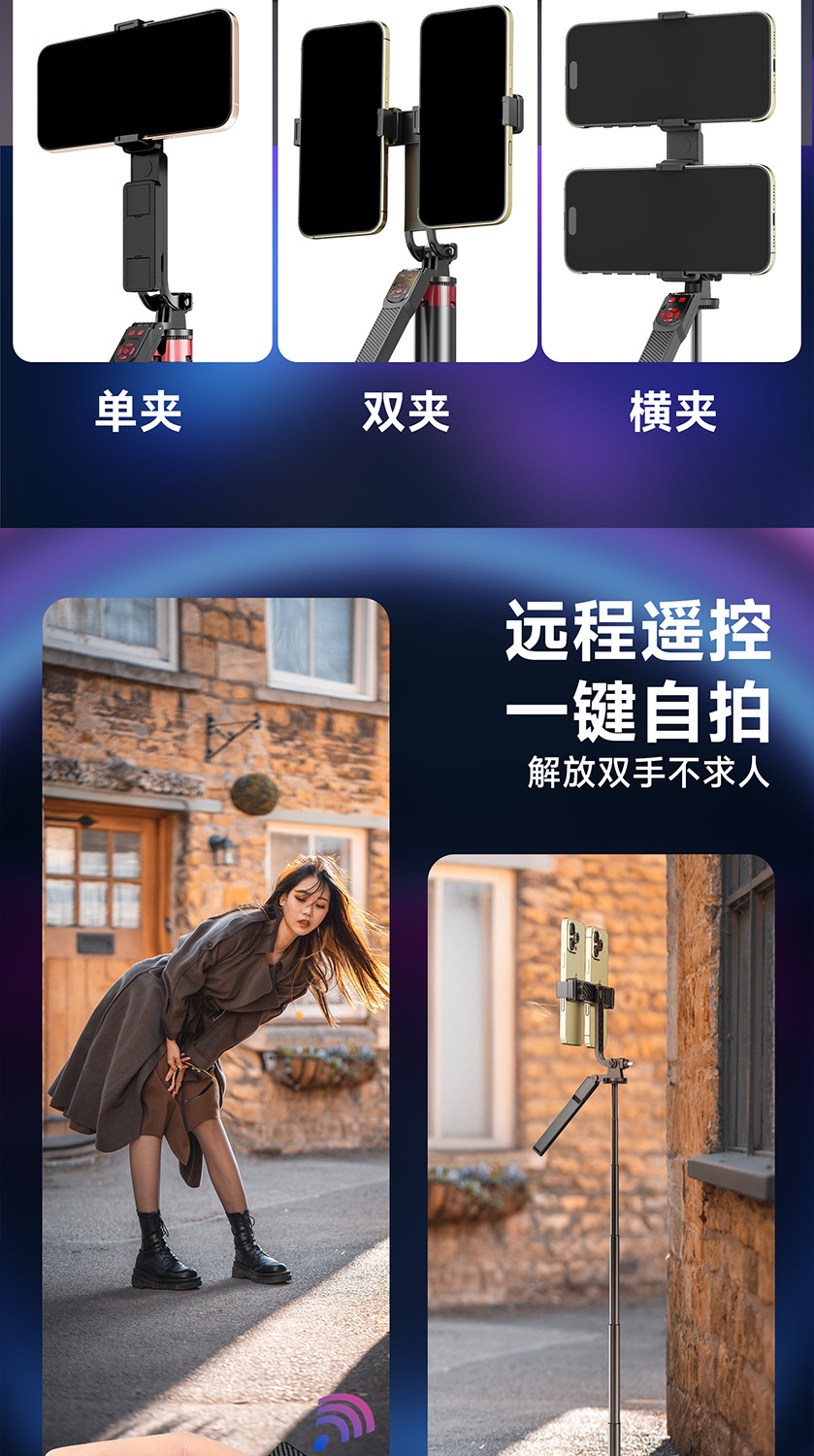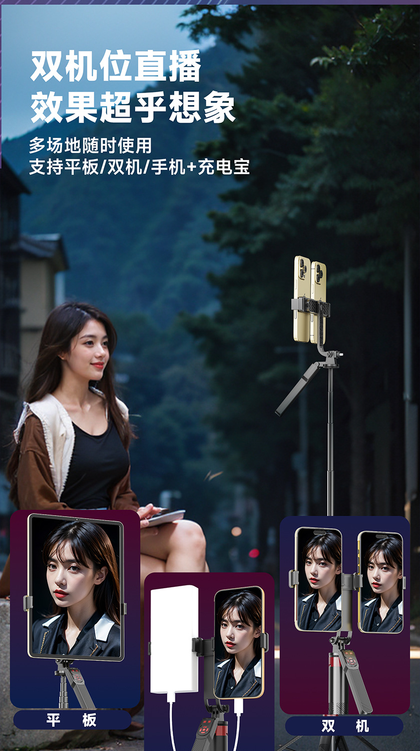듀얼 카메라 셀카봉, 흔들림 방지, 접이식 블루투스 원격 제어, 휴대용 태블릿, 라이브 방송 스탠드, 셀카용 안정기