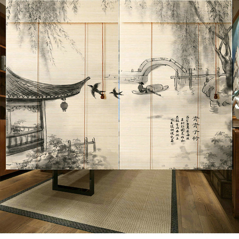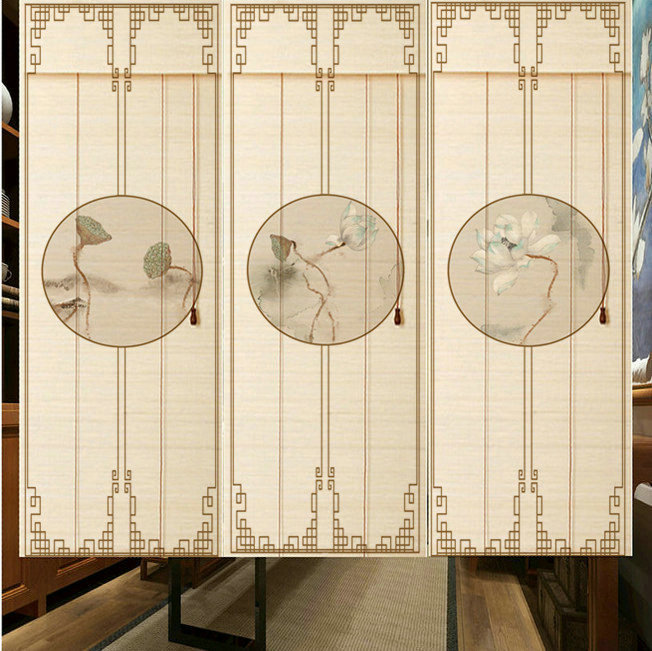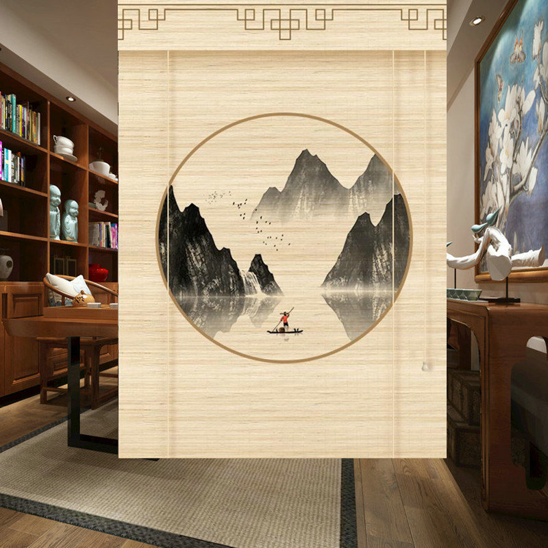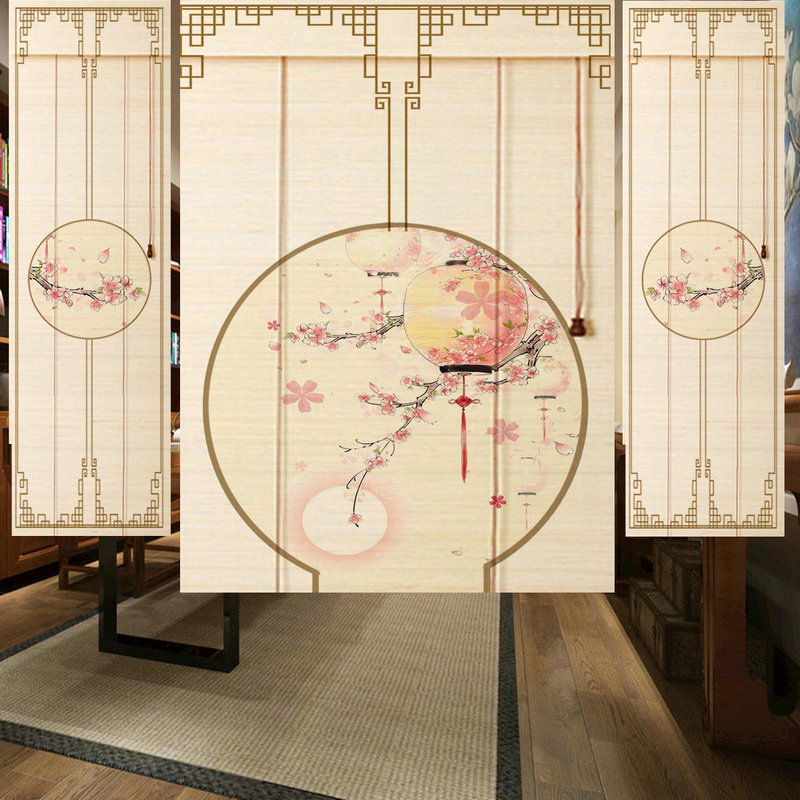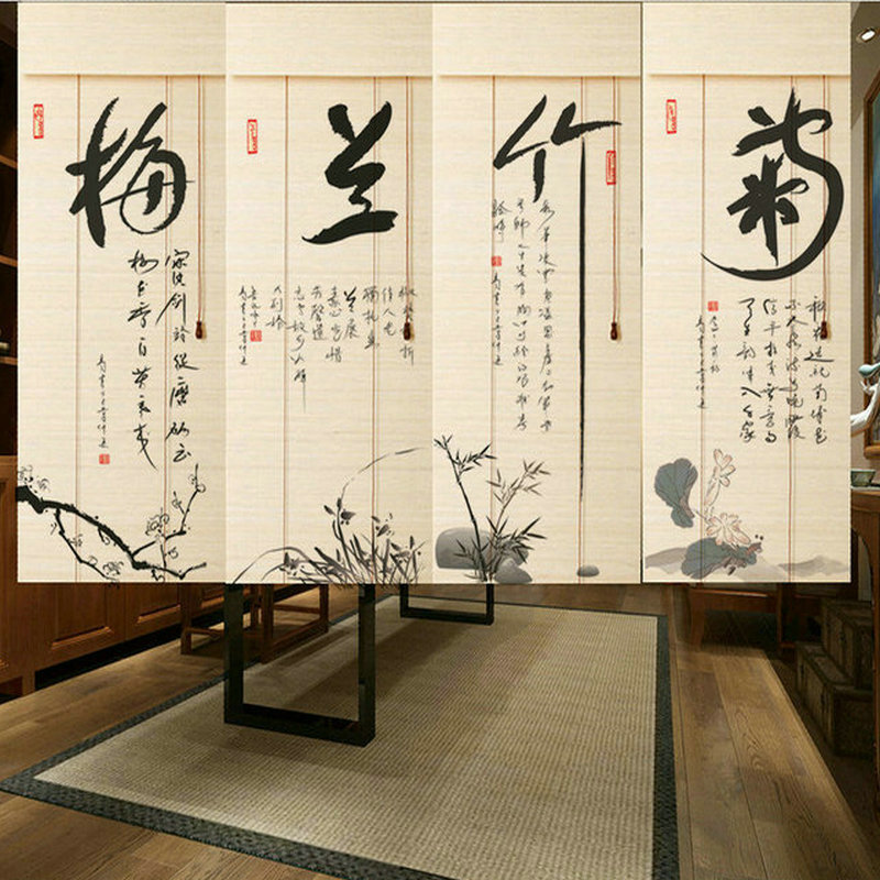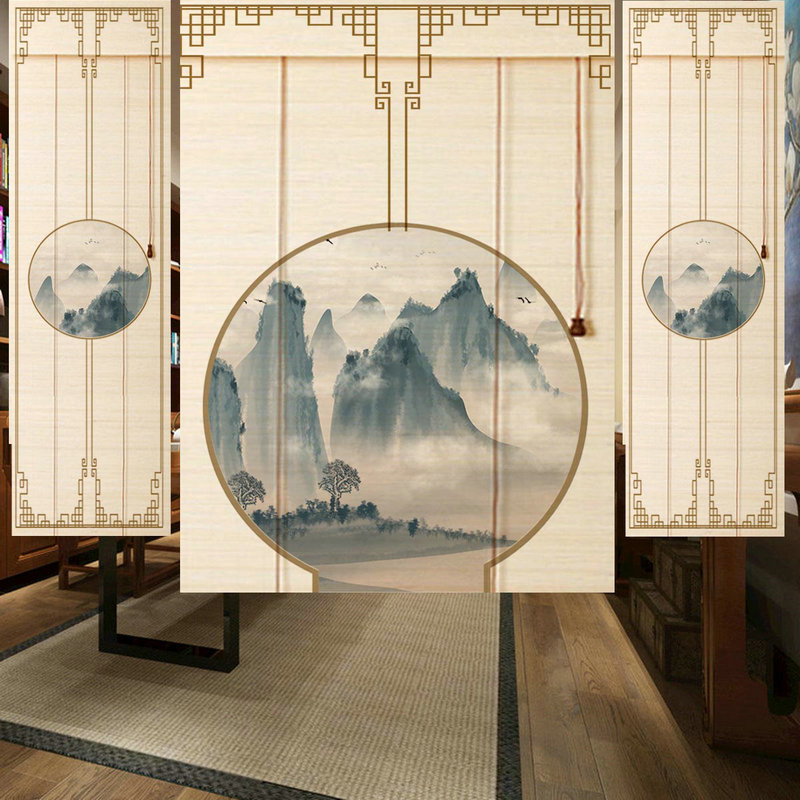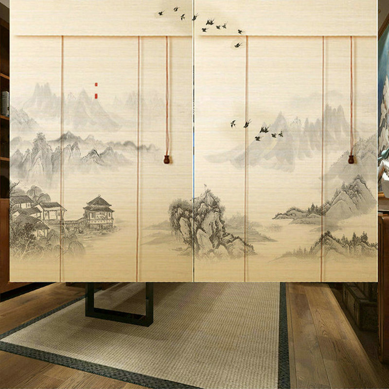 [신규] 복고풍 인쇄 대나무 커튼 롤러 블라인드 리프팅 커튼 교수형 그림 찻집 장식 빛 차단 파티션 롤링 도어 커튼