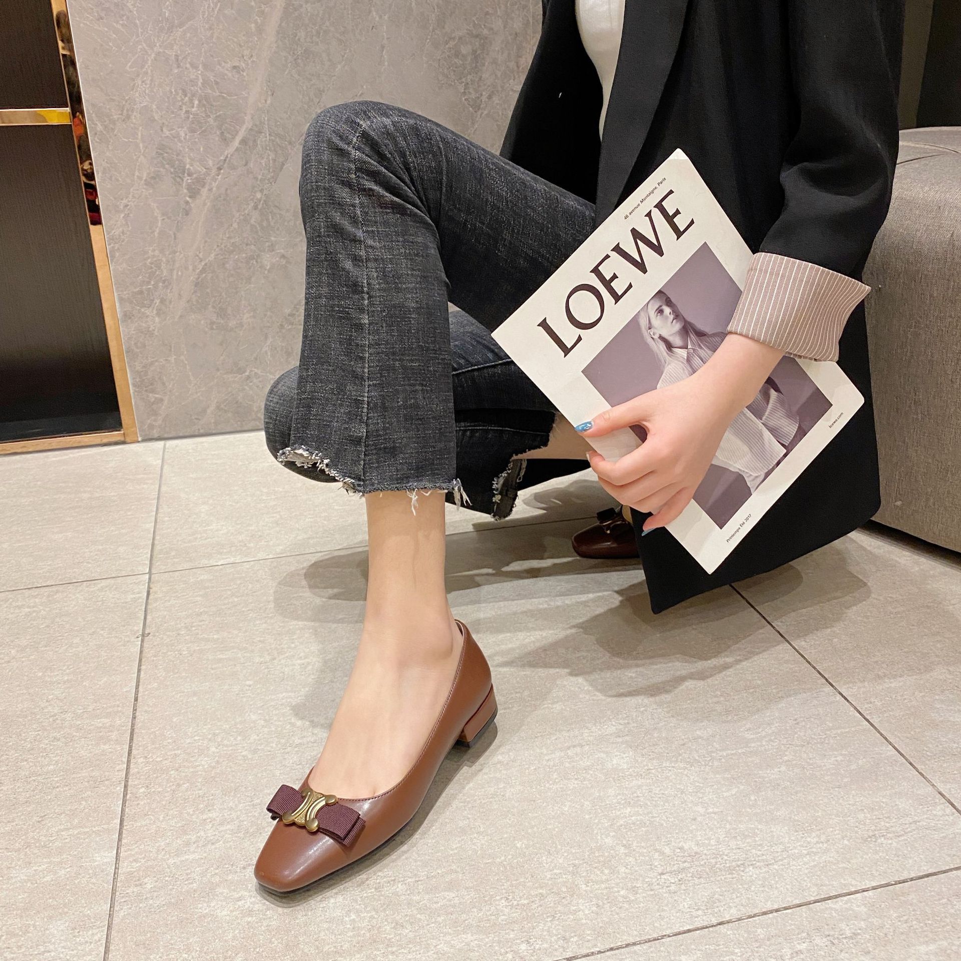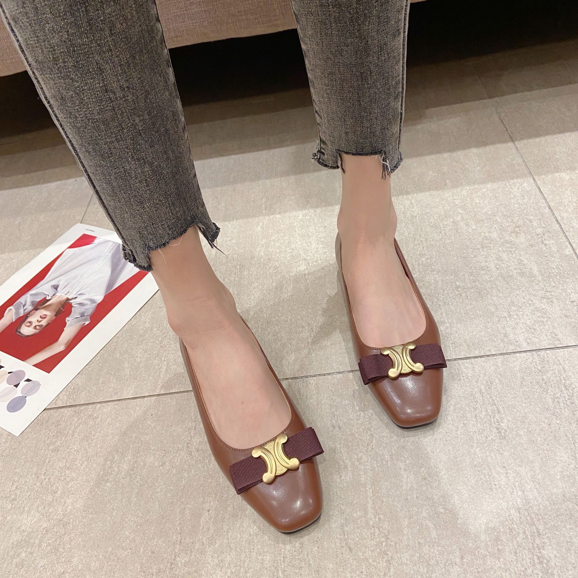 2025 새로운 개선문 금속 버클 스퀘어 토 신발 나비 매듭 플랫 로우 힐 여성 신발 작은 향기 스타일 싱글 신발 여성스토어 가기