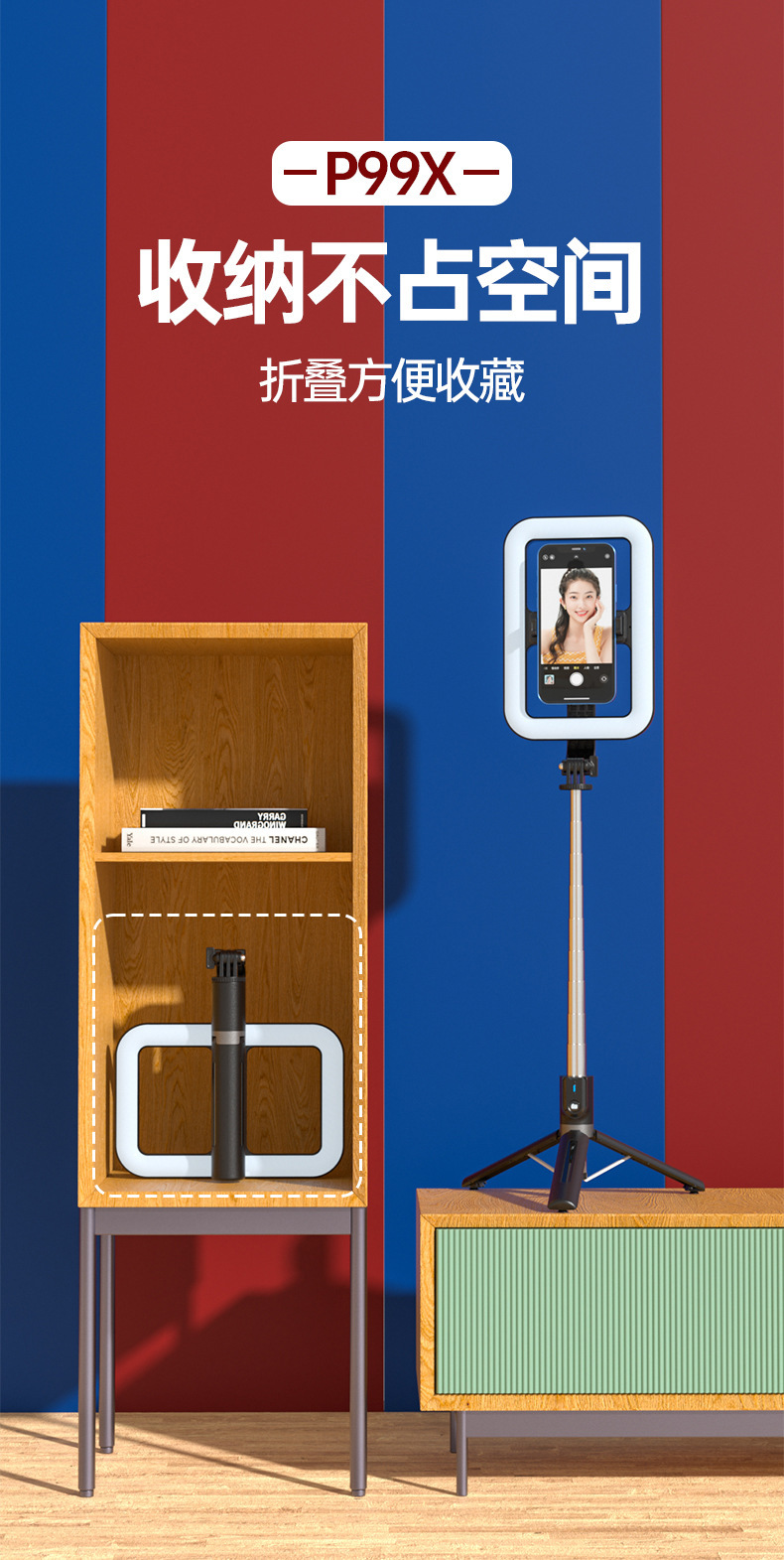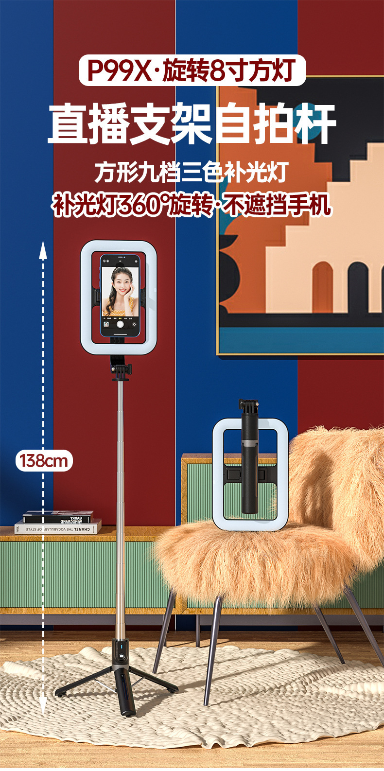 새로운 8inch 뷰티 필 라이트 셀카 스틱 블루투스 원격 제어 야외 바닥 접이식 확장형 라이브 스트리밍 삼각대