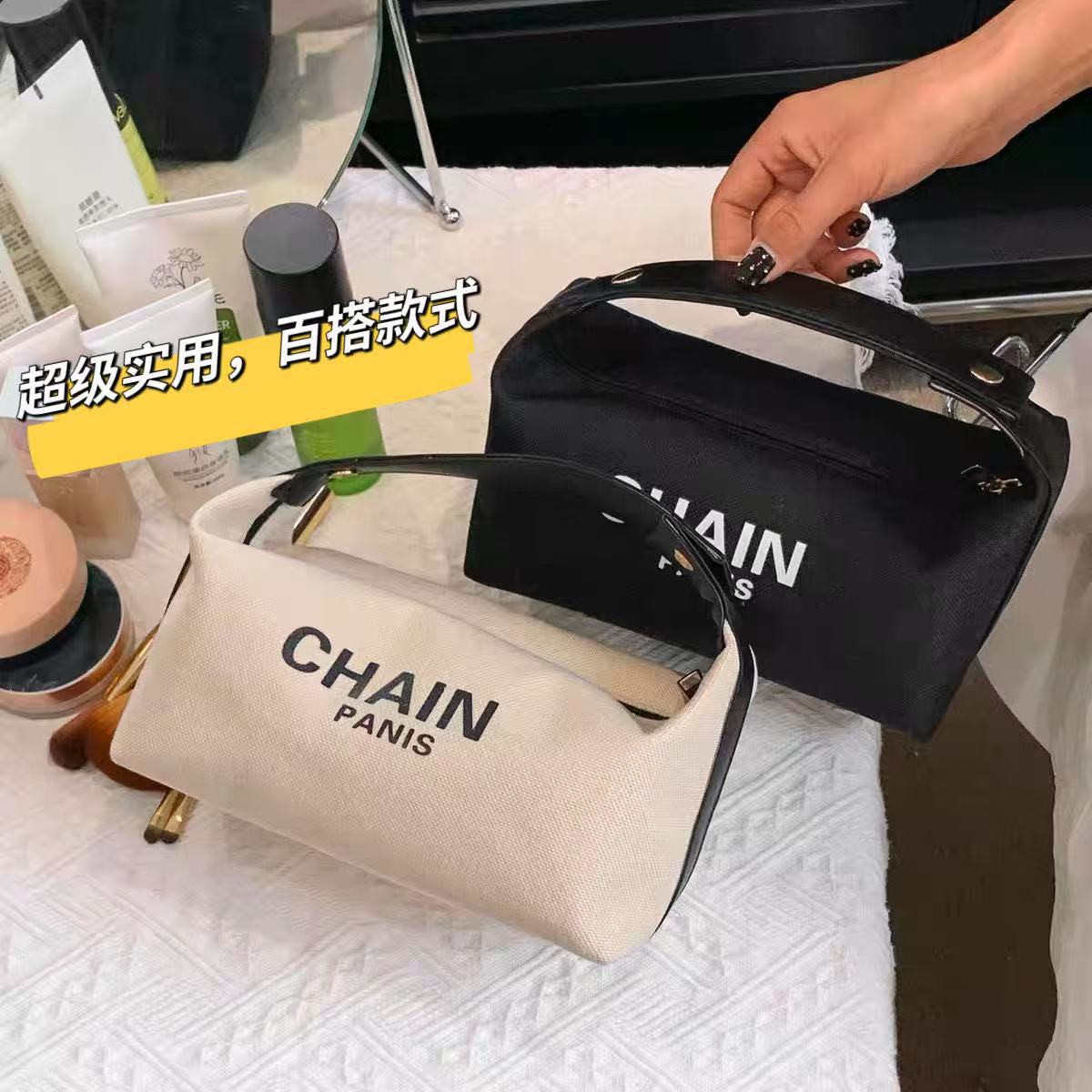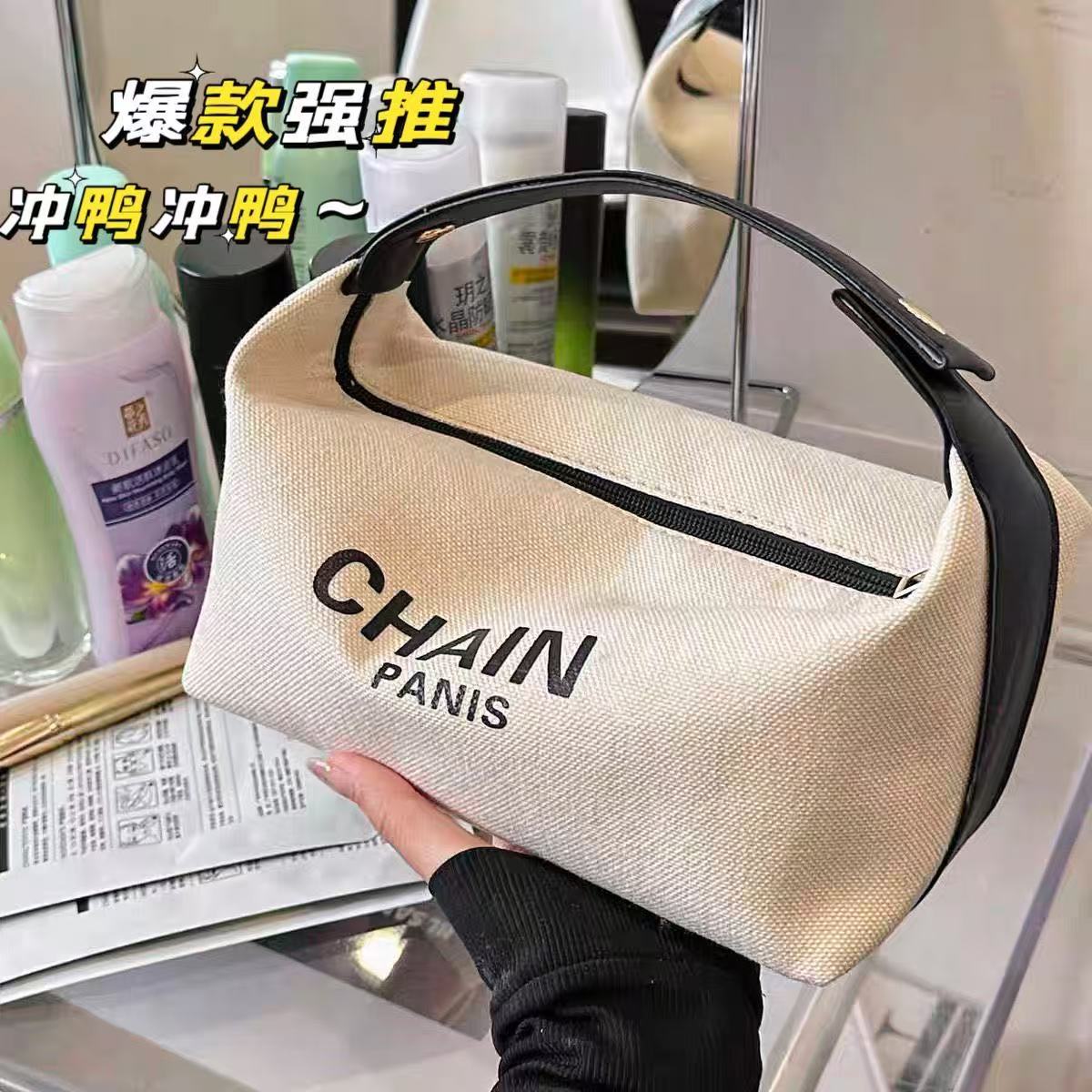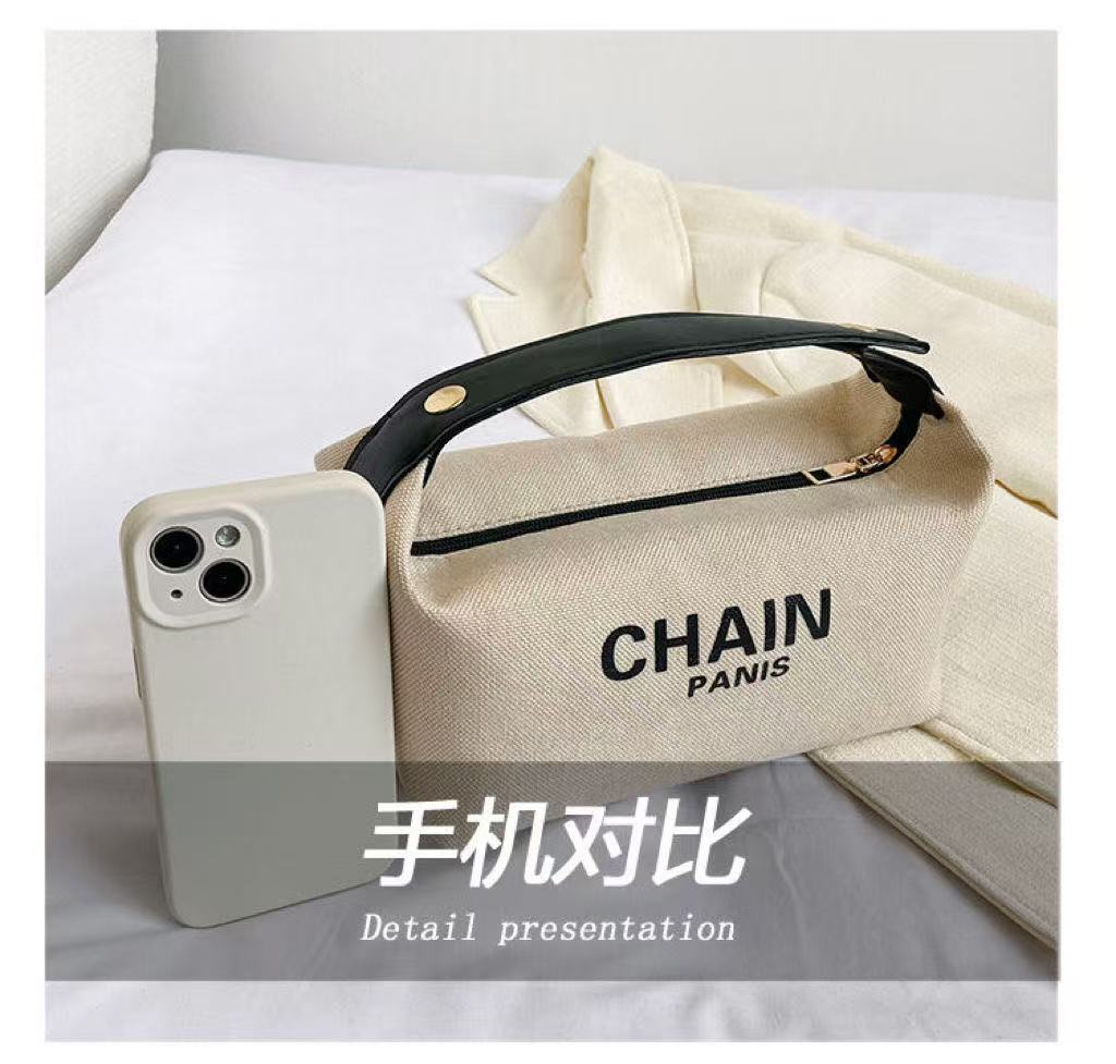 包包采用优质帆布面料,可装下一些日常的化妆品,尺寸为23*12*12;本产品可定制logo.
