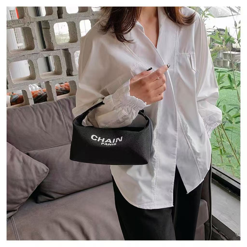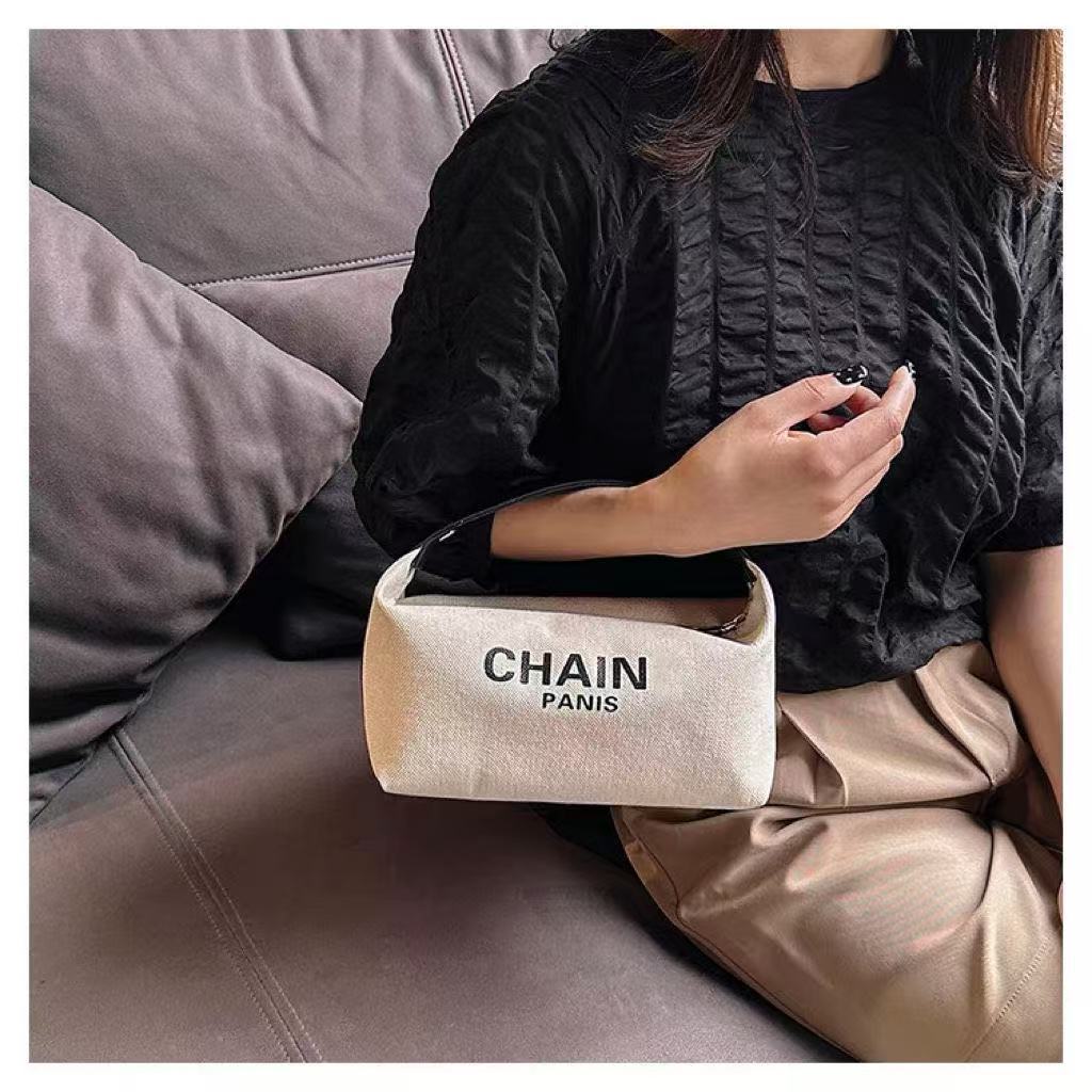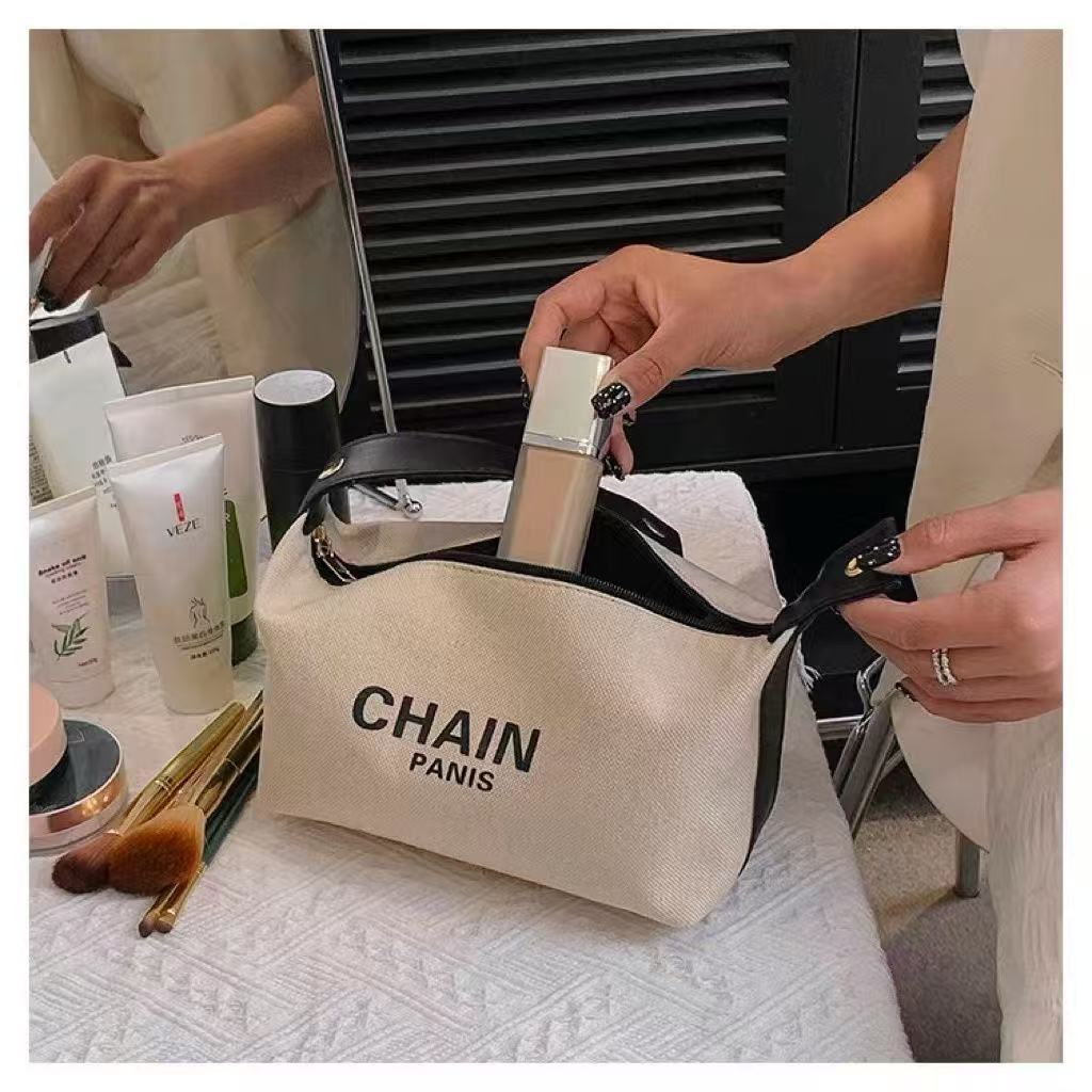 包包采用优质帆布面料,可装下一些日常的化妆品,尺寸为23*12*12;本产品可定制logo.