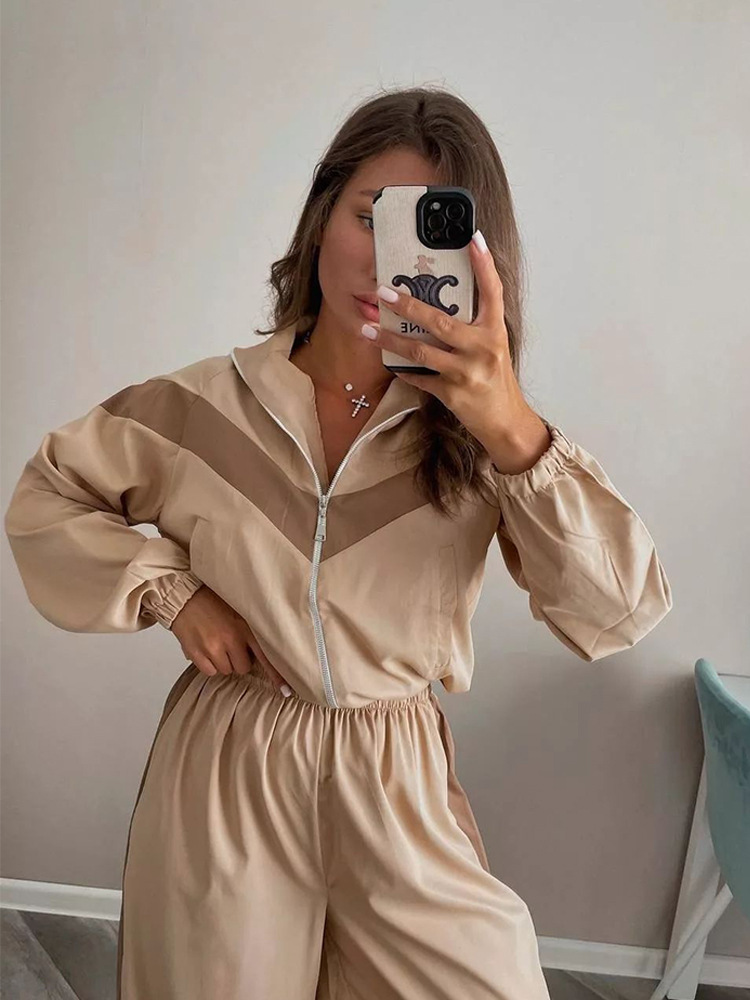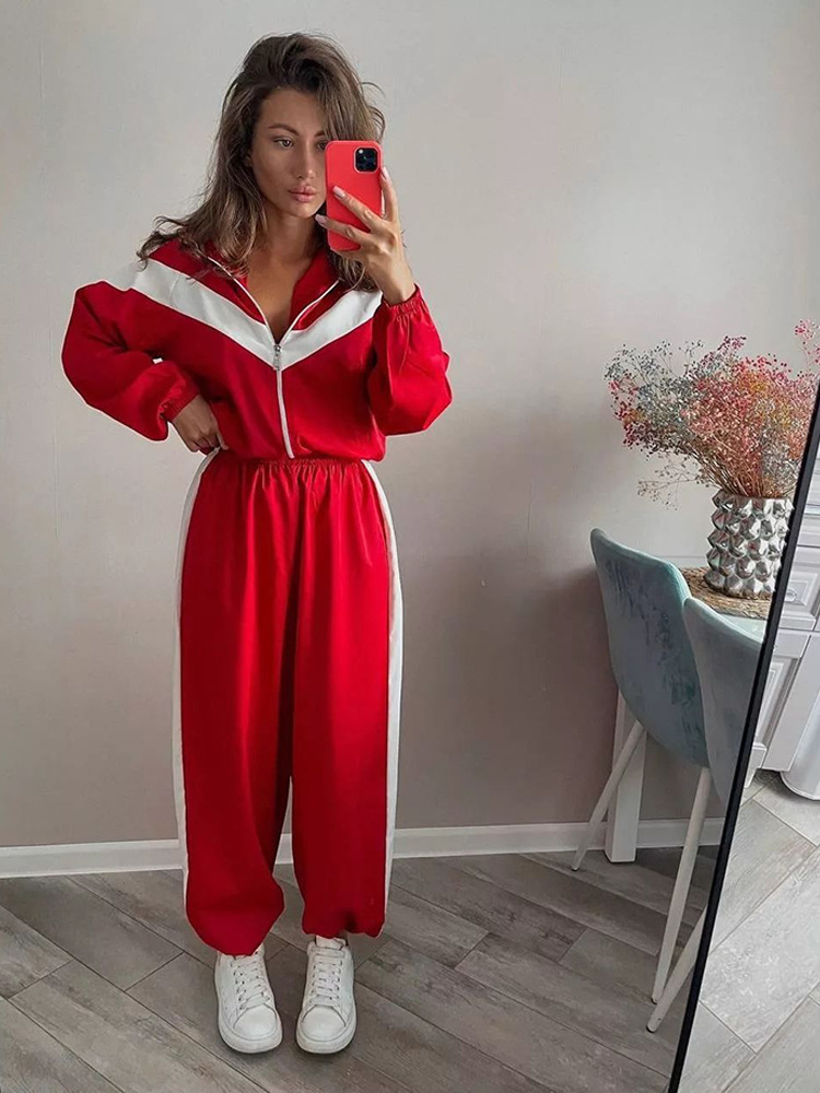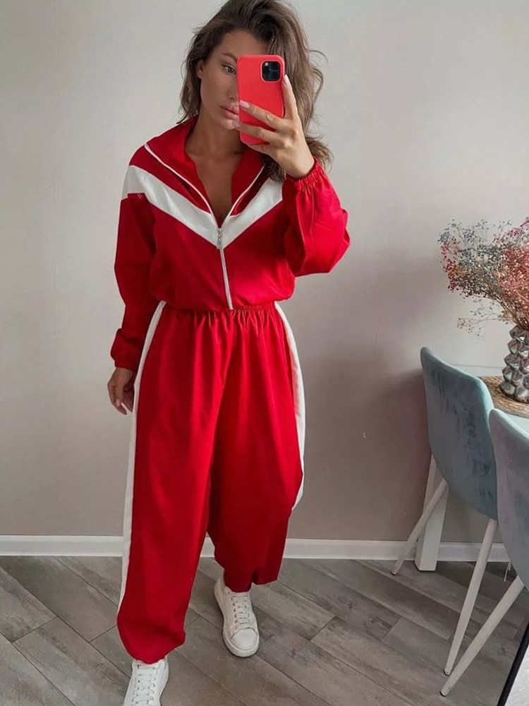 패셔너블하고 캐주얼한 아마존 여성복 크로스보더 유럽과 미국의 긴팔 대비 색상 스포츠 카디건 바지 정장 스트리트 스타일 정장스토어 가기
