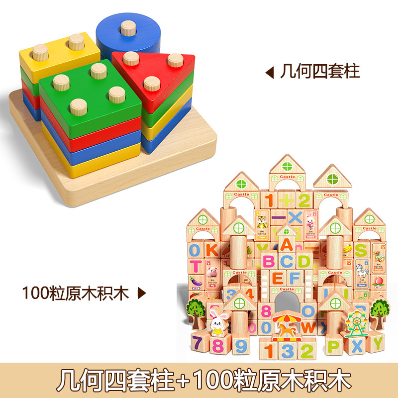 • 몬테소리 조기 교육 기하학 기둥 4세트 + 나무색 [인지 빌딩 블록] 100개 봉지
