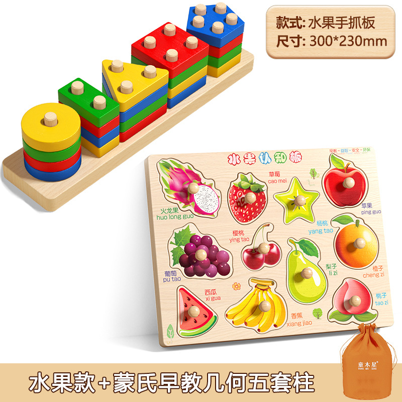 • 과일 스타일 [11가지 과일 퍼즐 + 베이스 플레이트] 보관 가방 + 몬테소리 조기 교육 기하학 5개 포함
