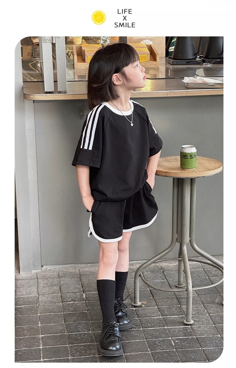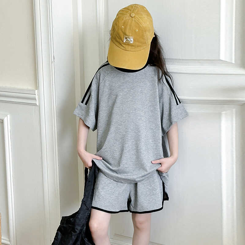 국경 간 소녀 한국 여름 정장 어린이 여름 스타일 스포츠 의류 큰 어린이를위한 반팔 반바지 투피스 세트