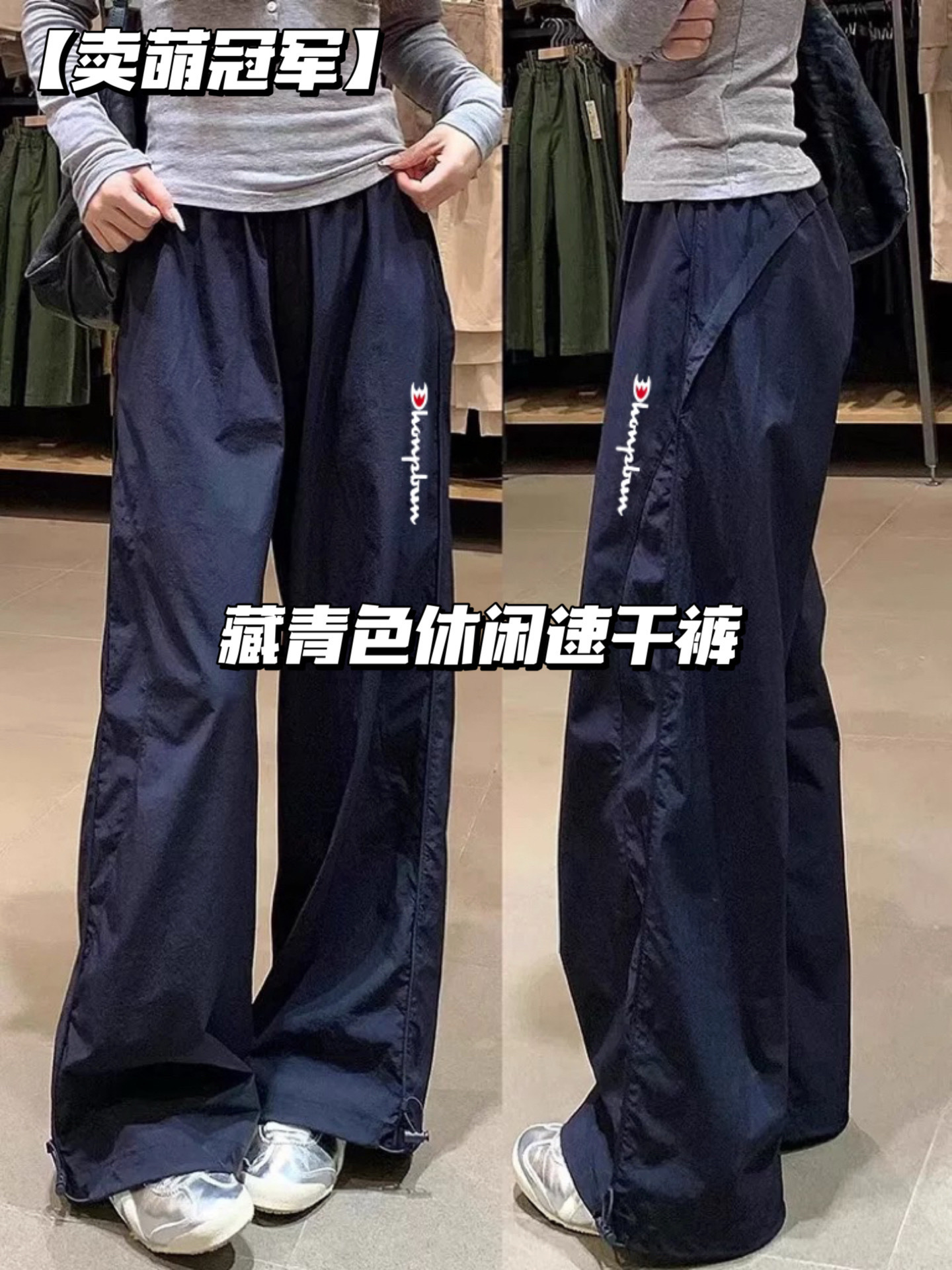 남성과 여성을 위한 귀여운 챔피언 네이비 블루 캐주얼 속건 바지, 루즈하고 슬림하며 다재다능한 새로운 스포츠 및 레저 와이드 팬츠
