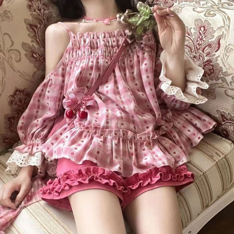 여름 달콤한 숲 스타일 연령 감소 서스펜더 오프 숄더 체크 무늬 탑 + 여성용 세련된 레이스 인 반바지 투피스 슈트스토어 가기
