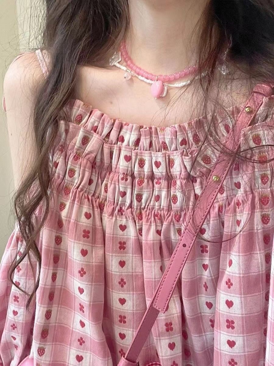 여름 달콤한 숲 스타일 연령 감소 서스펜더 오프 숄더 체크 무늬 탑 + 여성용 세련된 레이스 인 반바지 투피스 슈트
