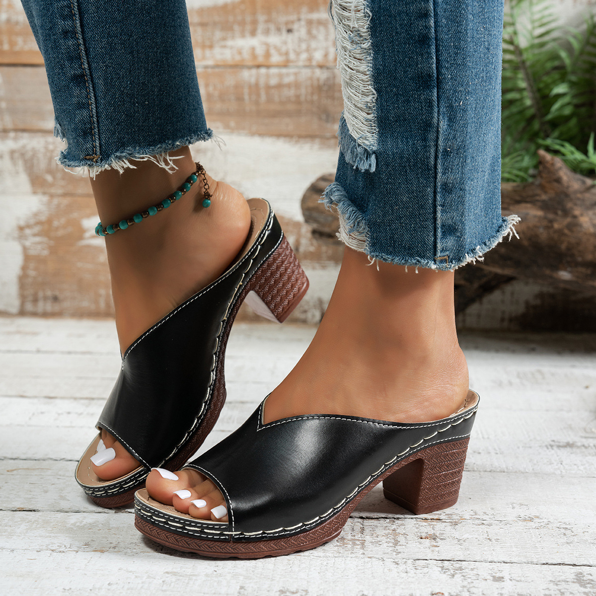 2025년 여름 신상 유럽 및 미국 크로스보더 대형 두꺼운 굽 샌들 여성 패션 하이힐 두꺼운 굽 물고기 입 슬리퍼 여성스토어 가기