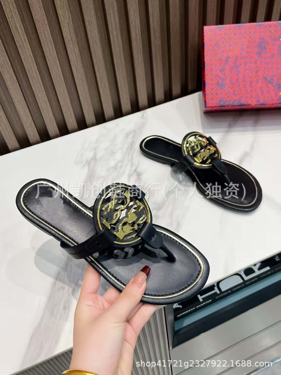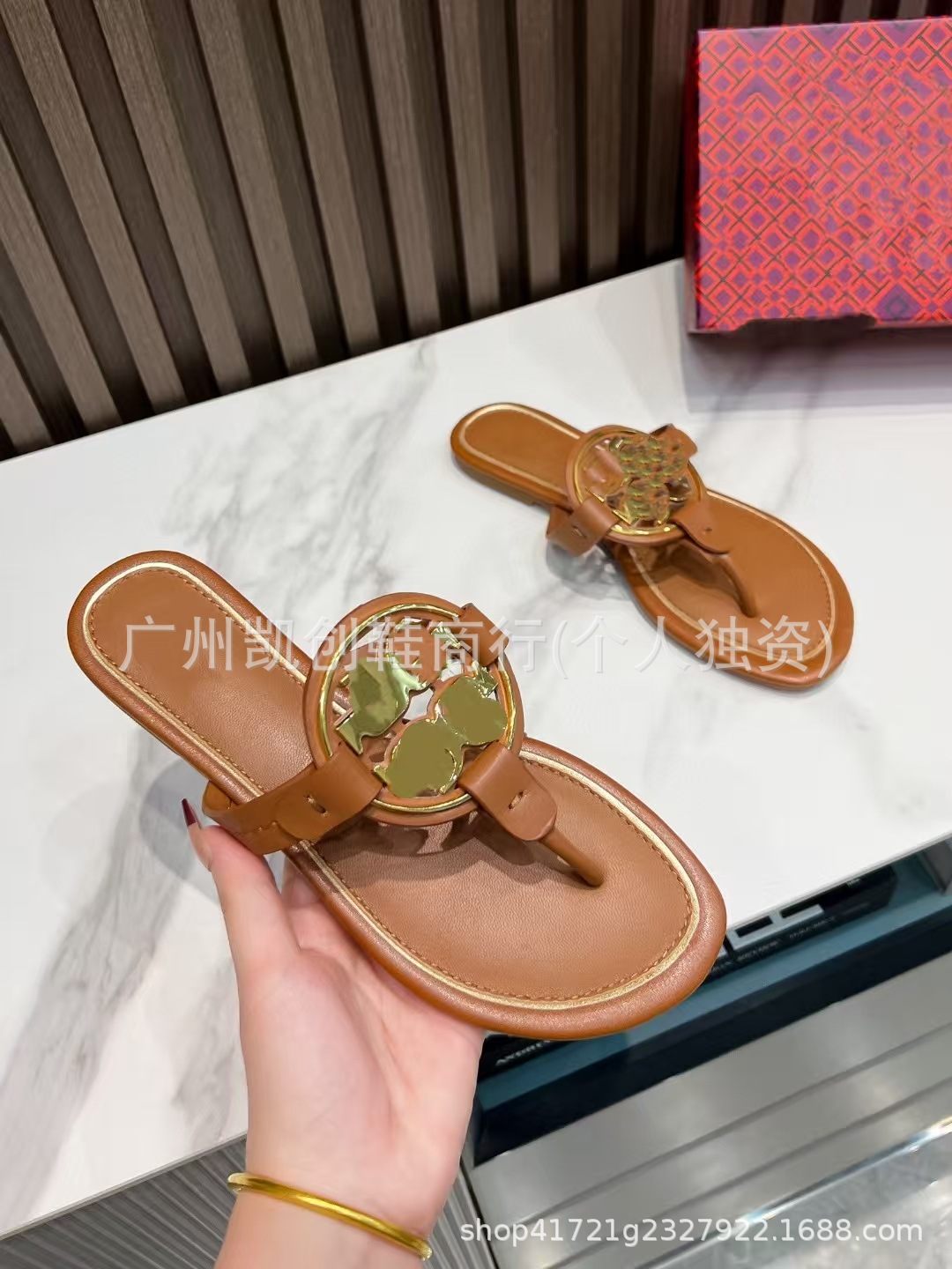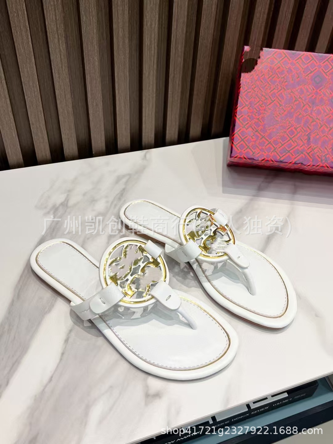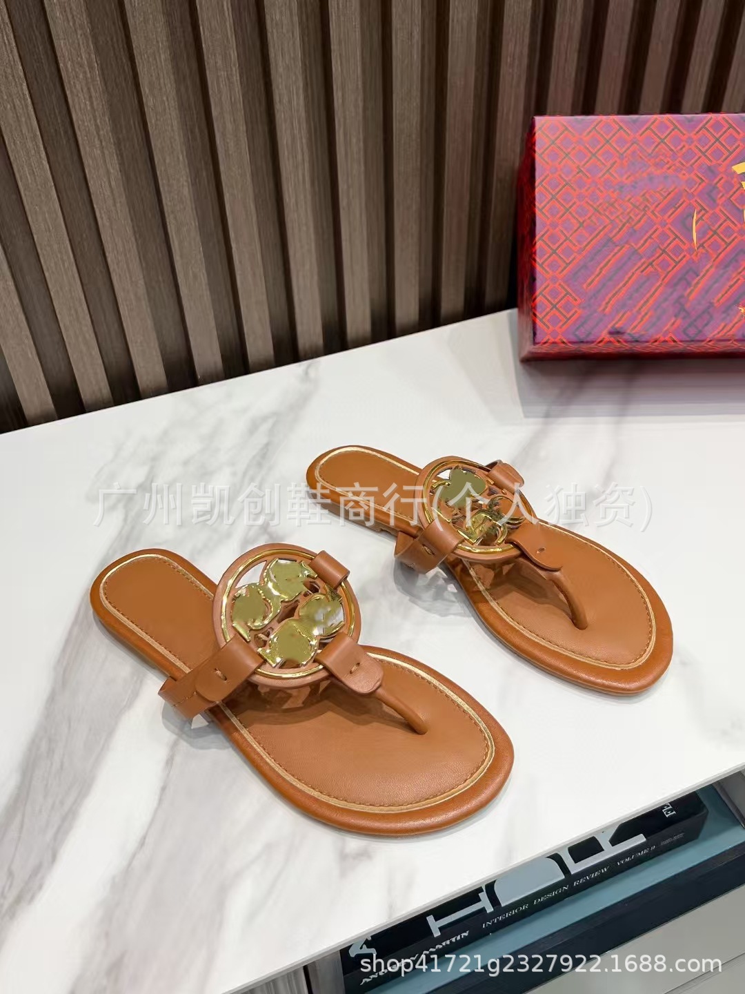 유럽과 미국의 대외 무역 2025 여름 신작 Tb 둥근 구멍 버클 플랫 슬리퍼 여성용 아웃웨어 헤링본 비치 휴가 플립 플롭스토어 가기