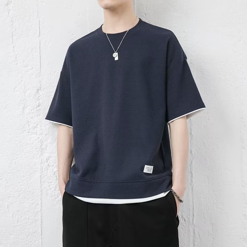 와플 여름 라운드 넥 티셔츠 반바지 투피스 남성 정장 편안한 얇은 가짜 투피스 반팔 정장 남성스토어 가기