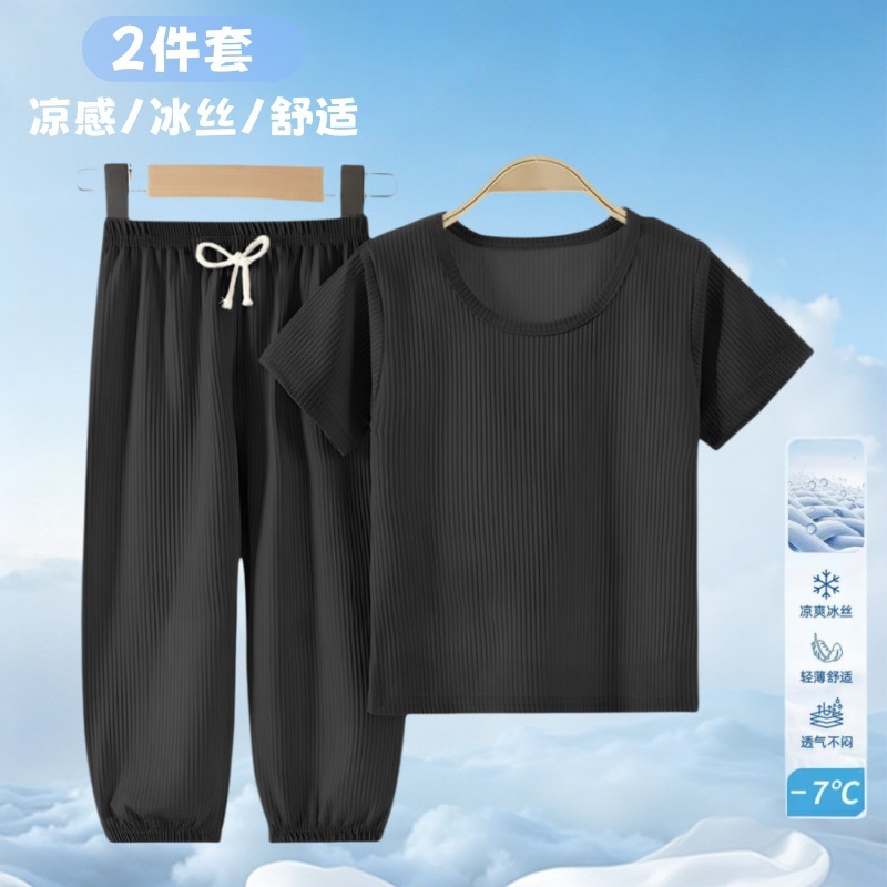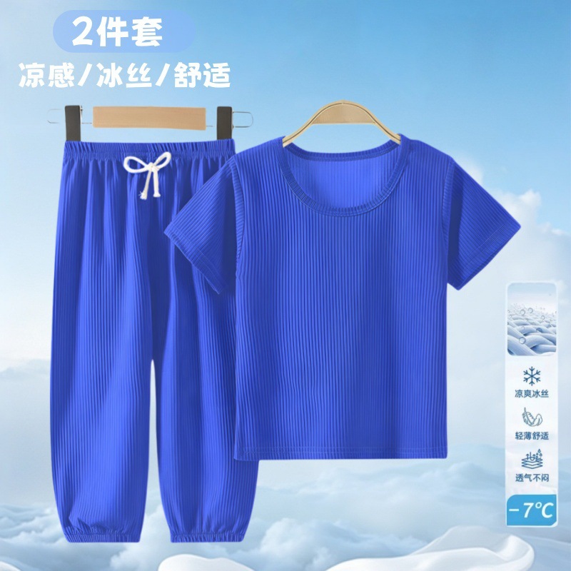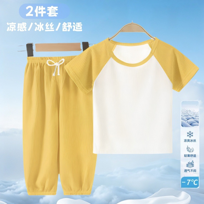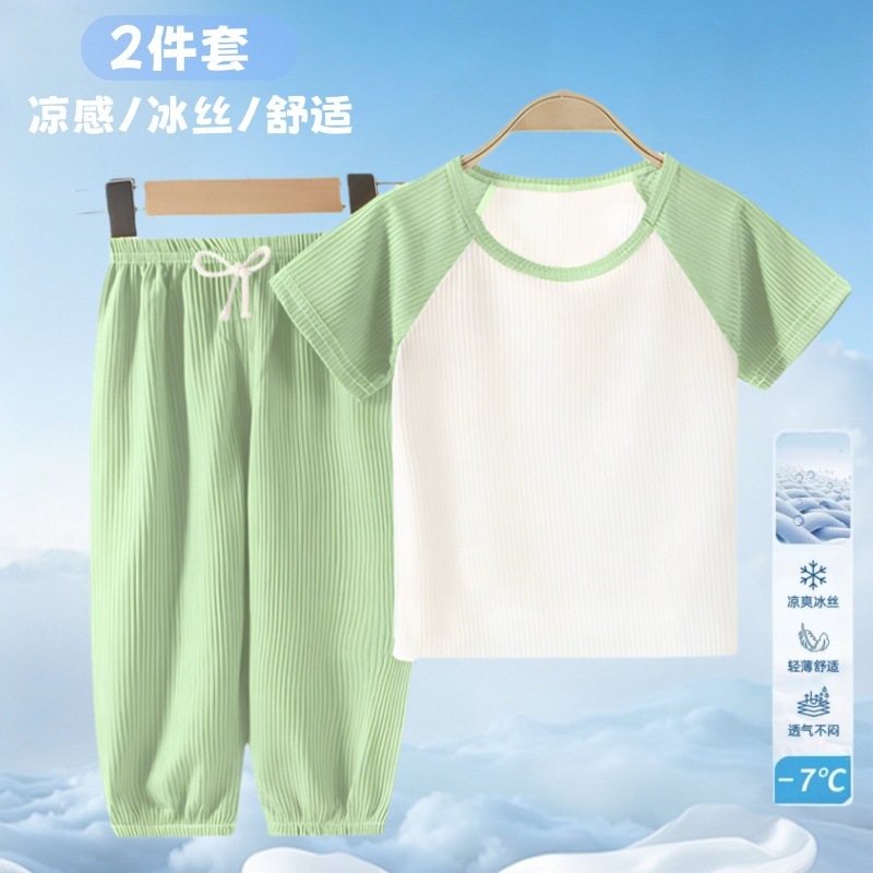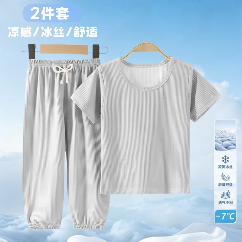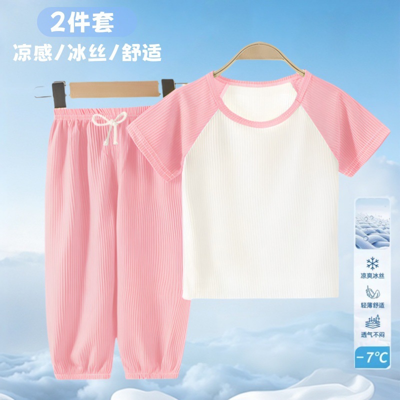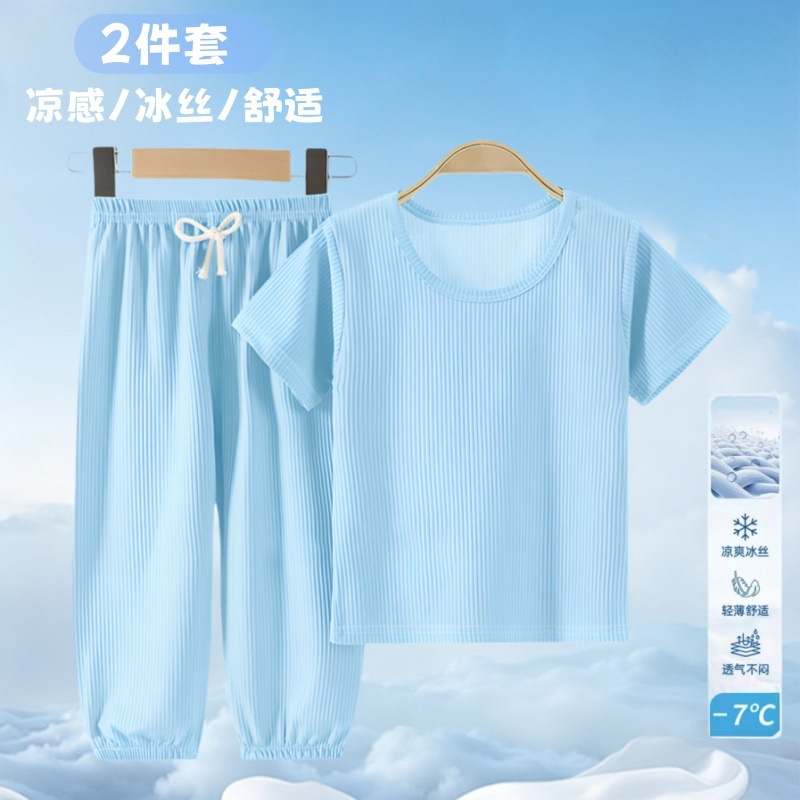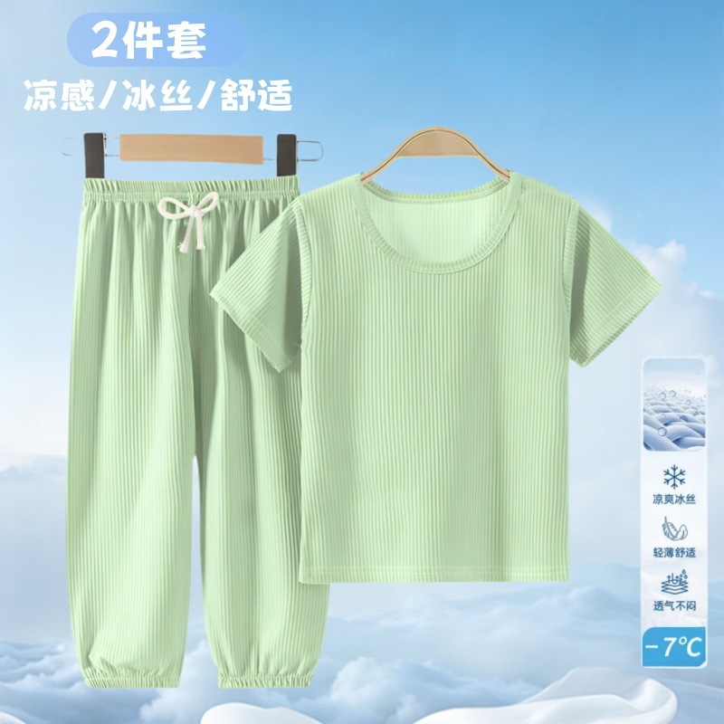 여름 어린이 모기 방지 바지 티셔츠 얼음 실크 정장 소년과 소녀 아기 얇은 반팔 잠옷 바지 투피스 세트