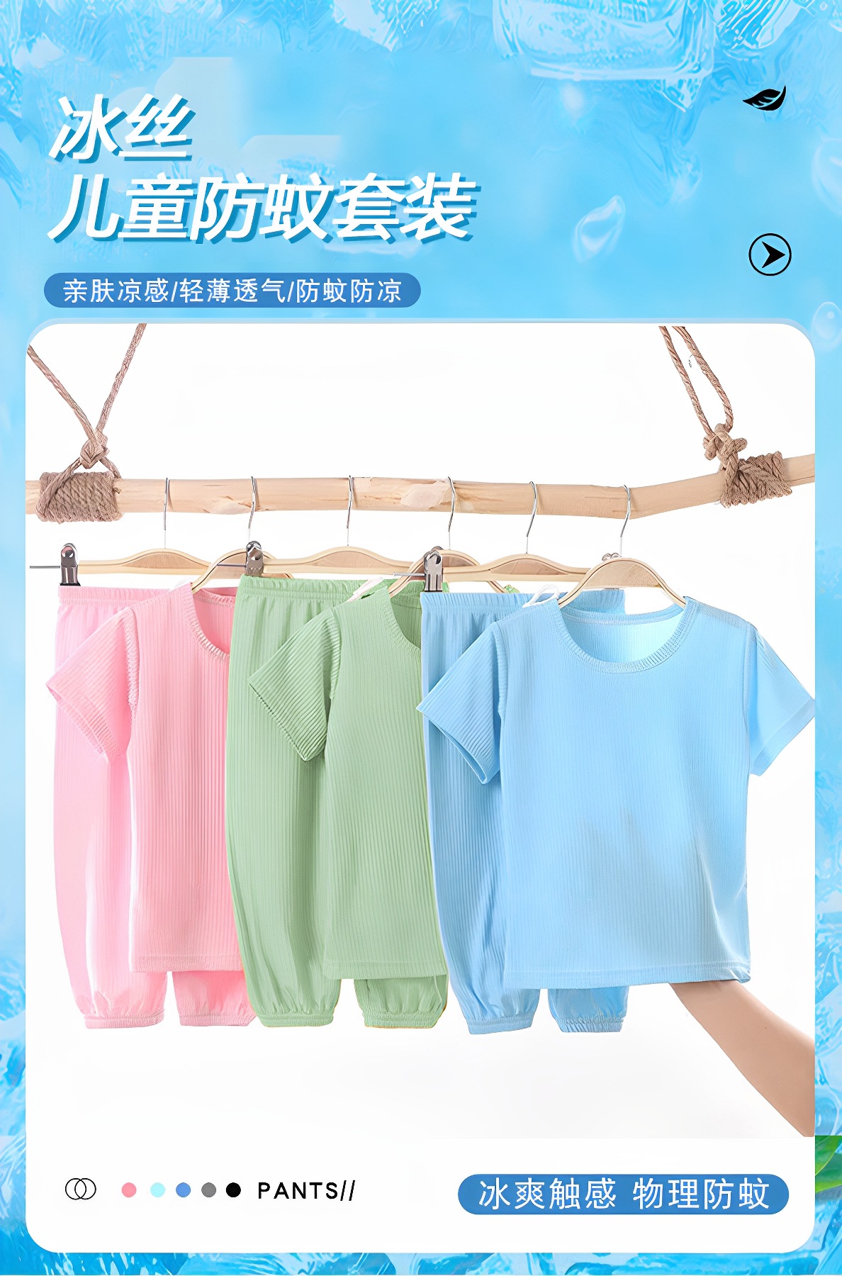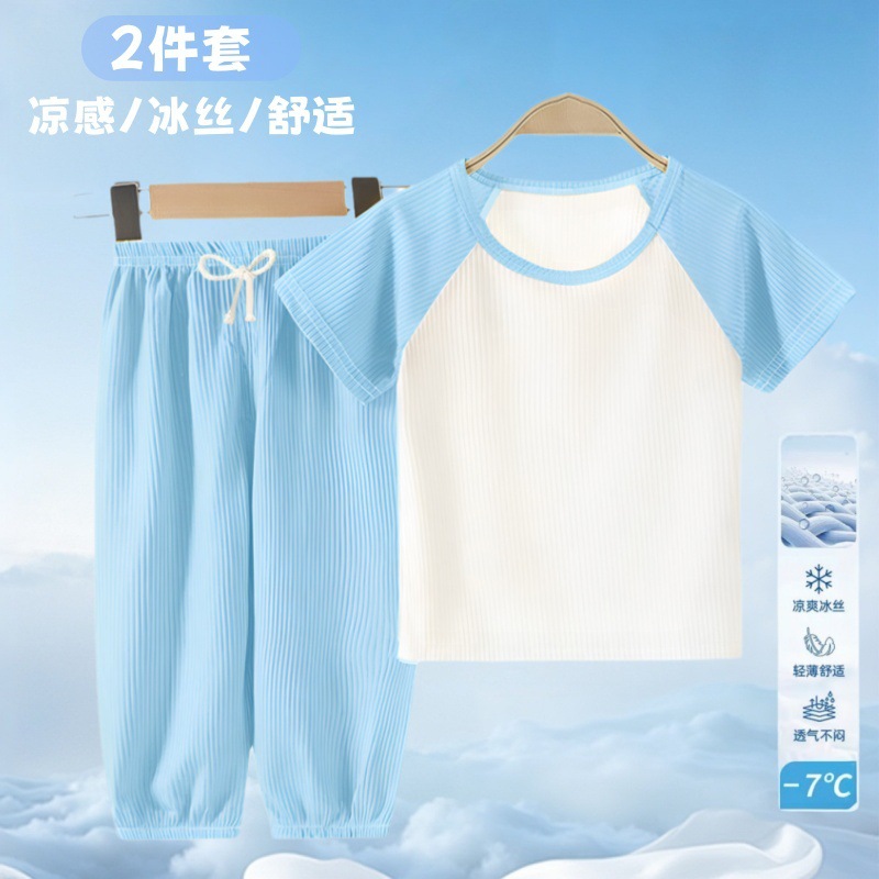 여름 어린이 모기 방지 바지 티셔츠 얼음 실크 정장 소년과 소녀 아기 얇은 반팔 잠옷 바지 투피스 세트스토어 가기