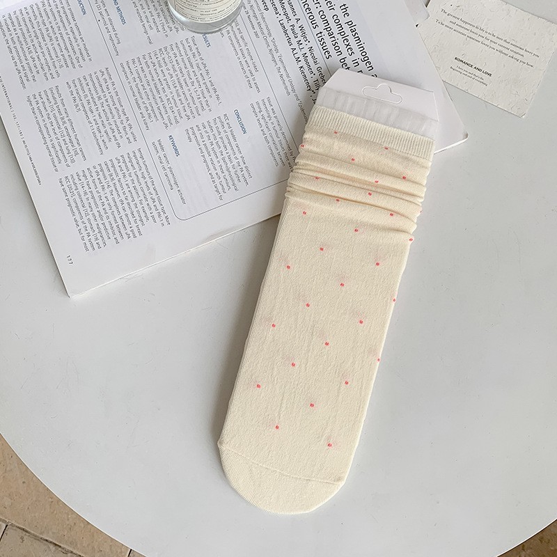 여성용 폴카 도트 양말 여름 얇은 양말 일본식 뼈없는 순수 코튼 레이스 발레 스타일 소녀 중간 튜브 양말