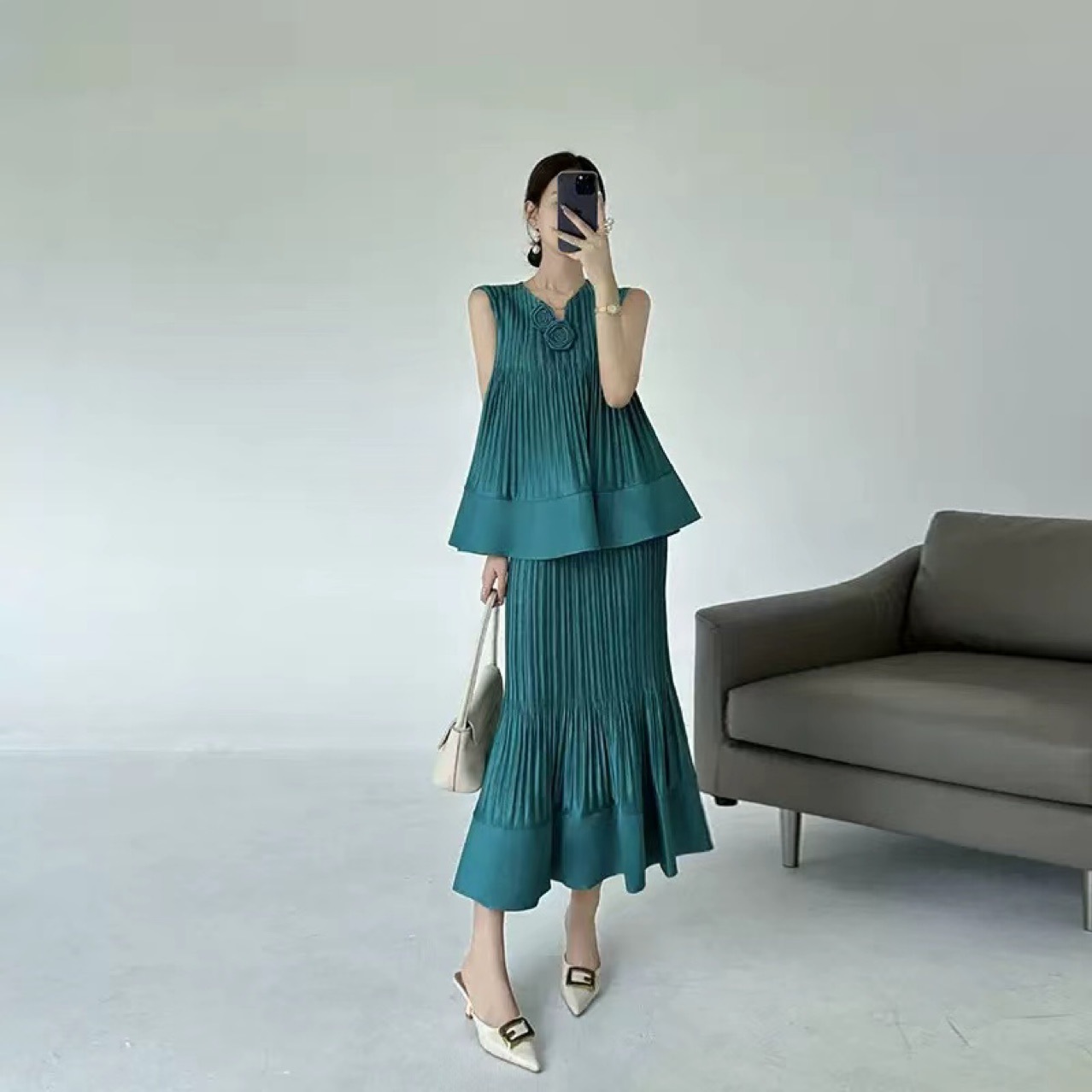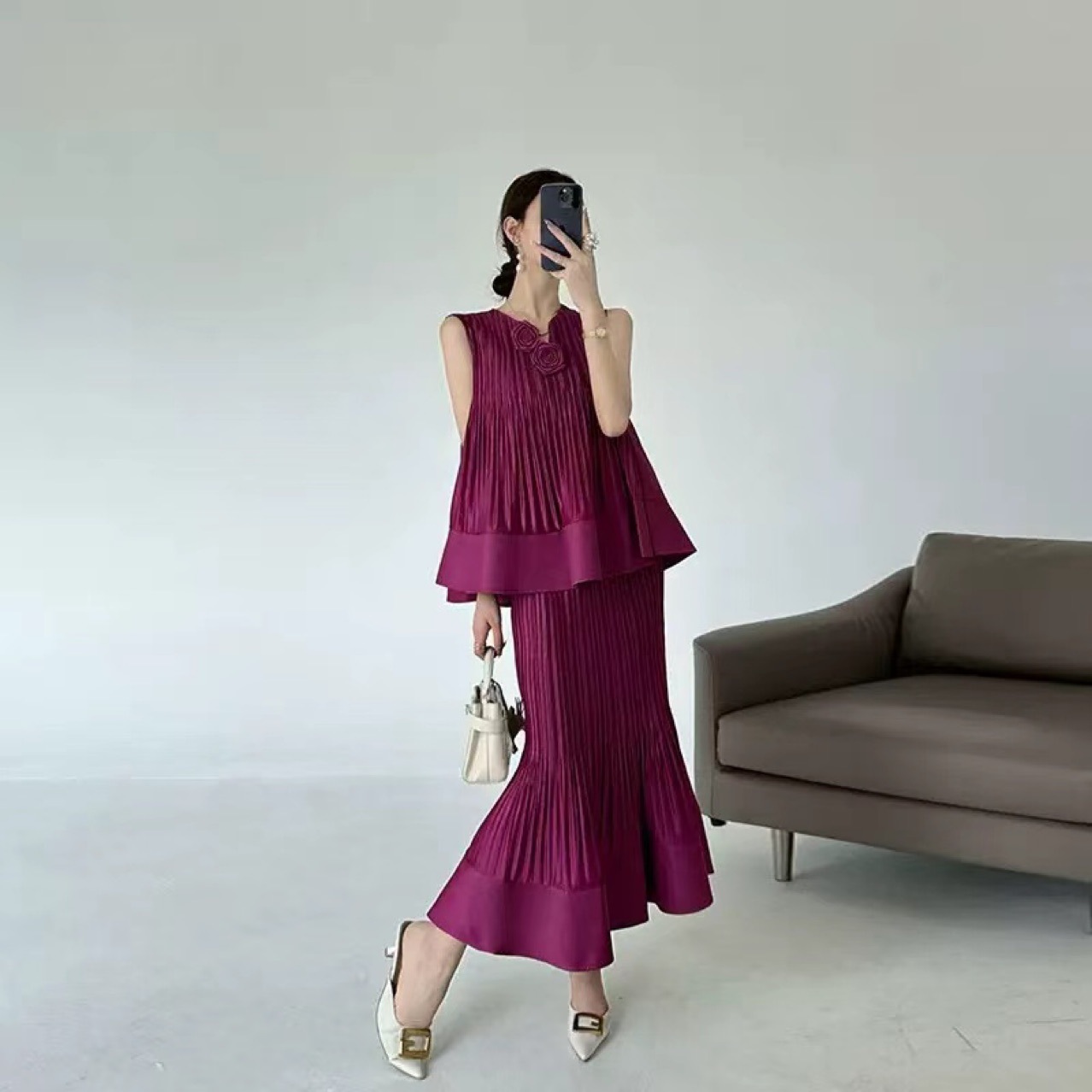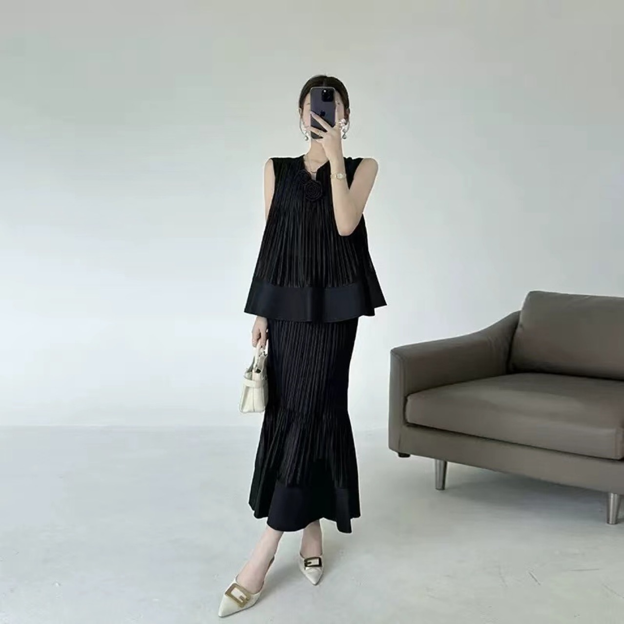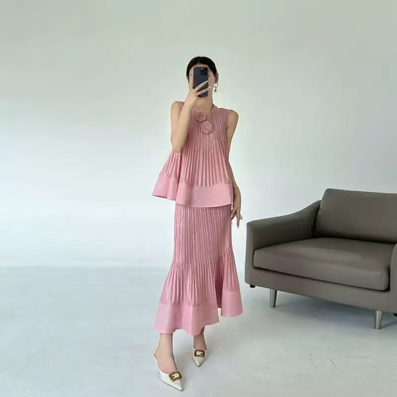 국경 간 패션 2025 여름 민소매 v 넥 기질 정장 스커트 입체 꽃 패션 디자인 솔리드 컬러 정장 여성스토어 가기