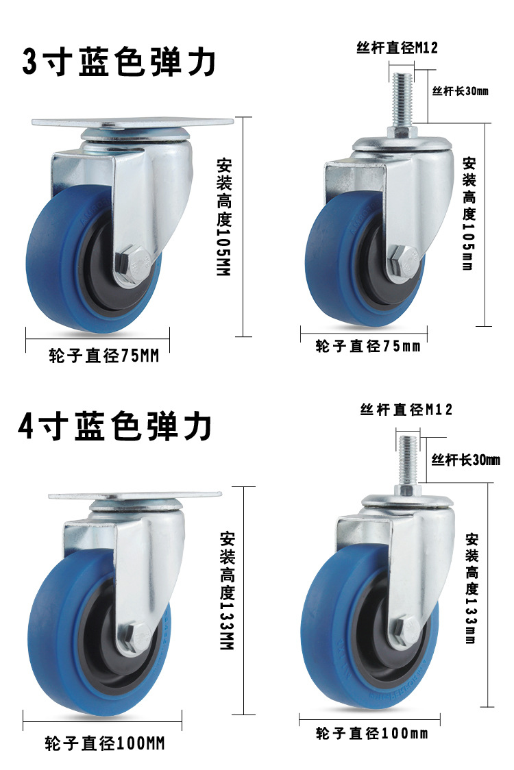 • 4inch 파란색 고무 탄성 나사 M12*30 범용 휠