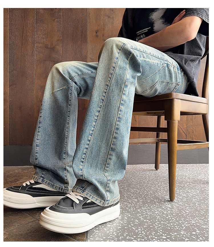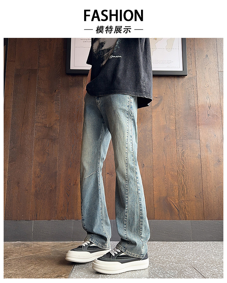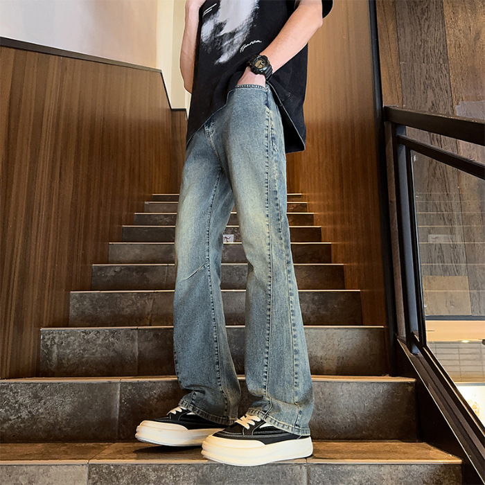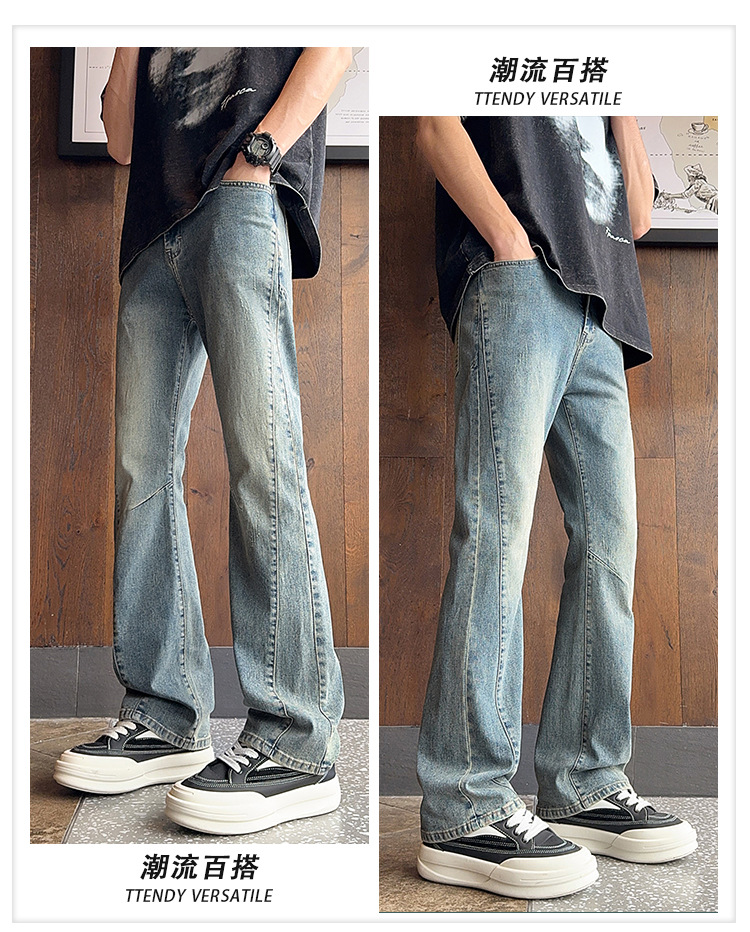 디컨스트럭티드 스플라이스 워크진 아메리칸 레트로 블루 바이브 채플린 마이크로 플레어 팬츠 남아용 히든 버튼 하이 스트리트 스트레이트 팬츠