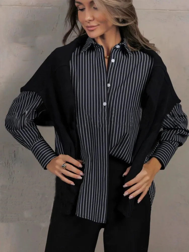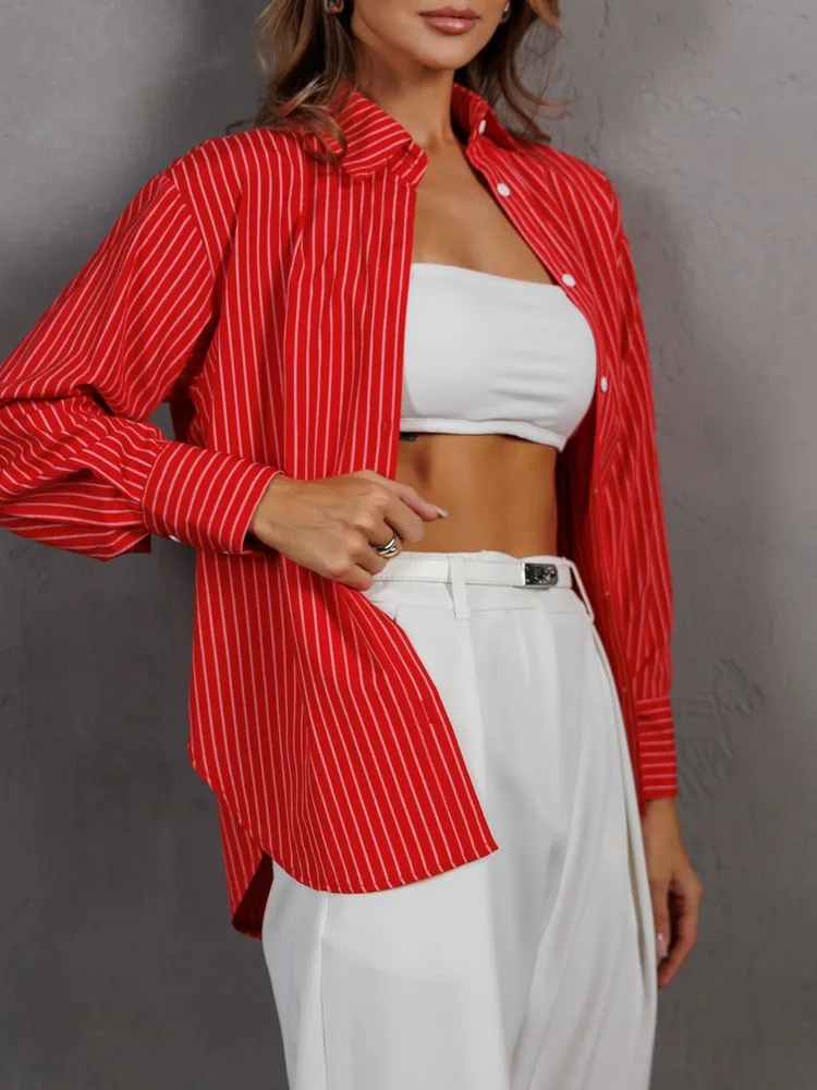 유럽 및 미국 무역 여성복 2026 신상 루즈핏 대형 사이즈 스트라이프 여성 셔츠 작업복 셔츠 캐주얼 긴팔 셔츠