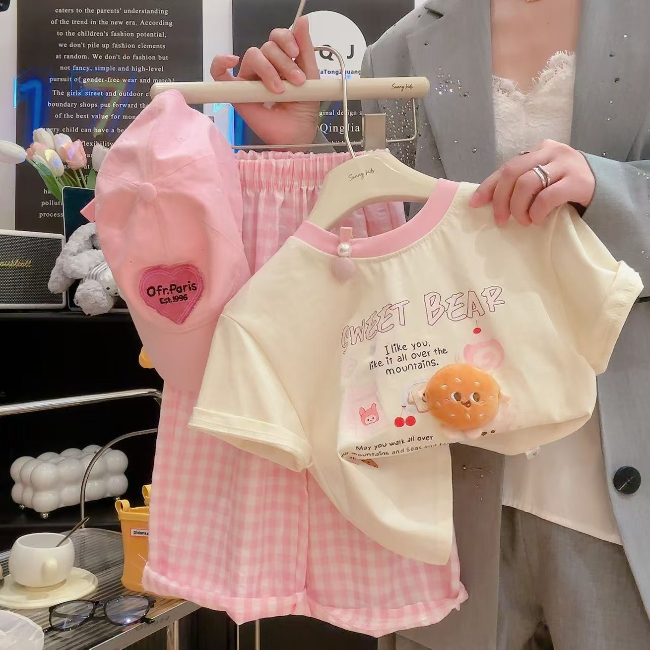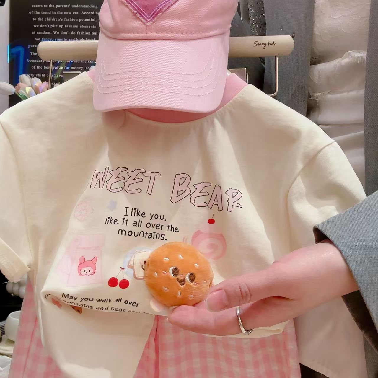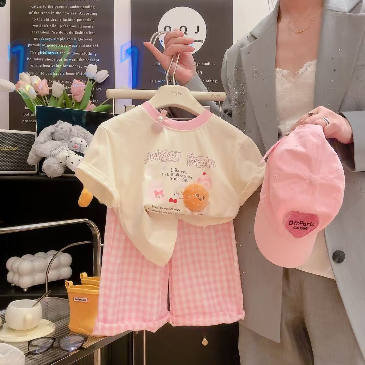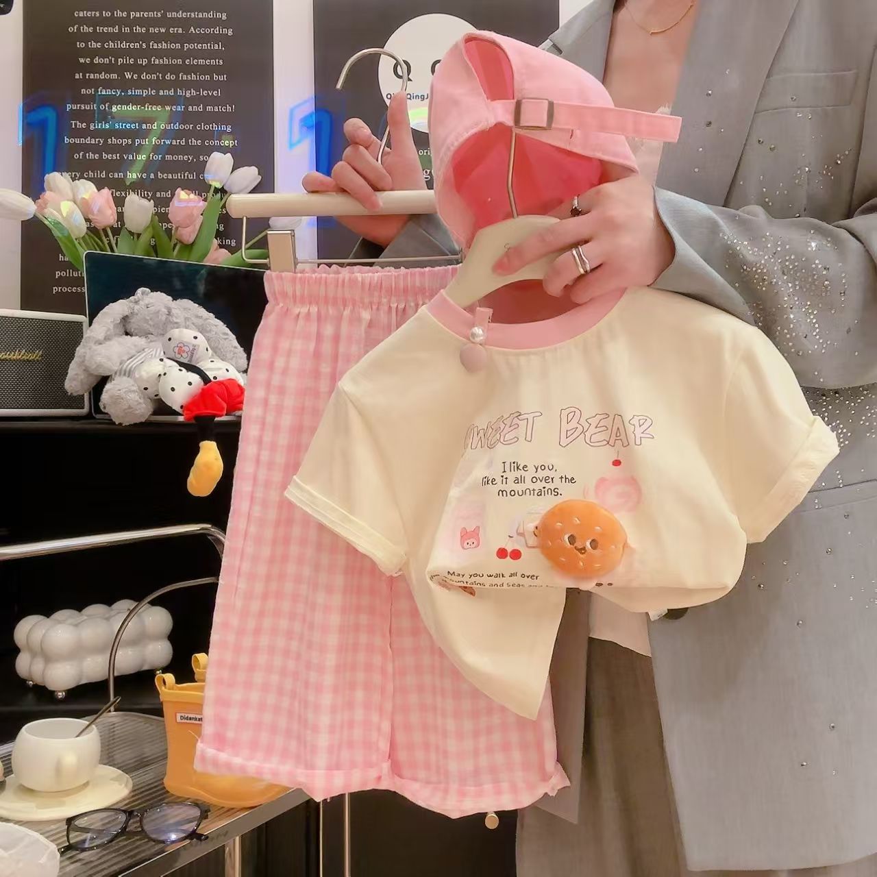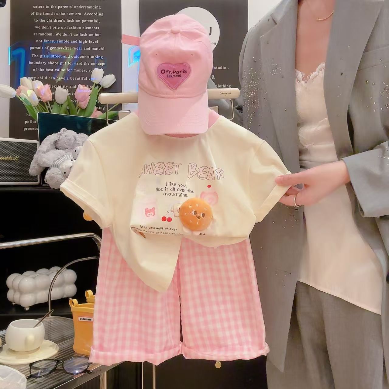 여자 만화 인형 인쇄 짧은 소매 격자 무늬 바지 캐주얼 폭발적인 패션 세트 2025 여름 새로운 어린이 티셔츠스토어 가기