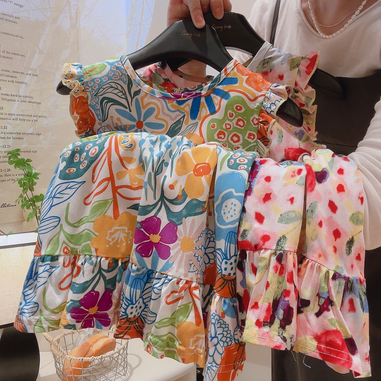여아 꽃무늬 레이스 코튼 실크 원피스 여름 한국 스타일 워크 드레스 세련된 공주풍 달콤한 스타일 통기성 좋은 러플