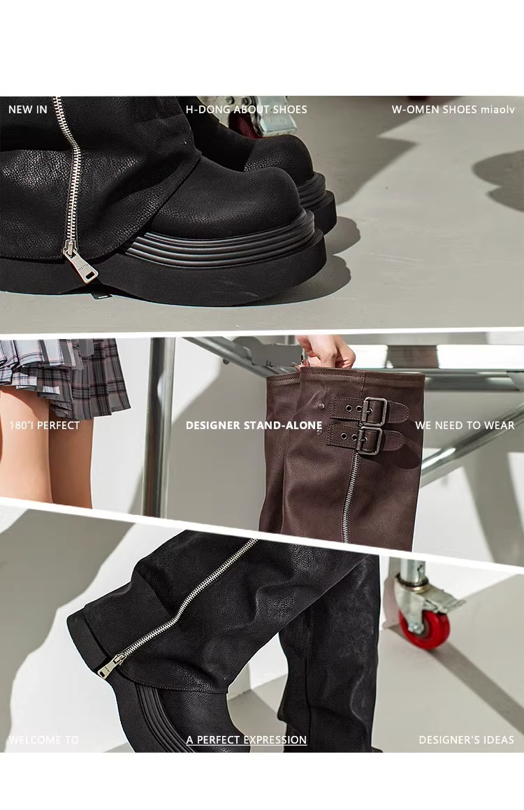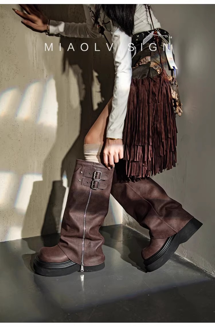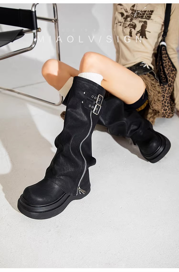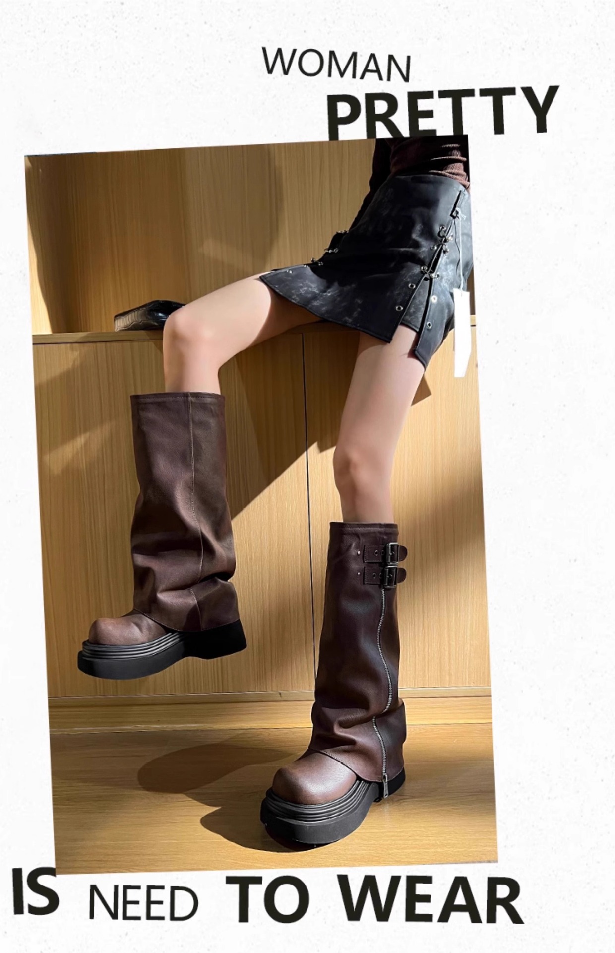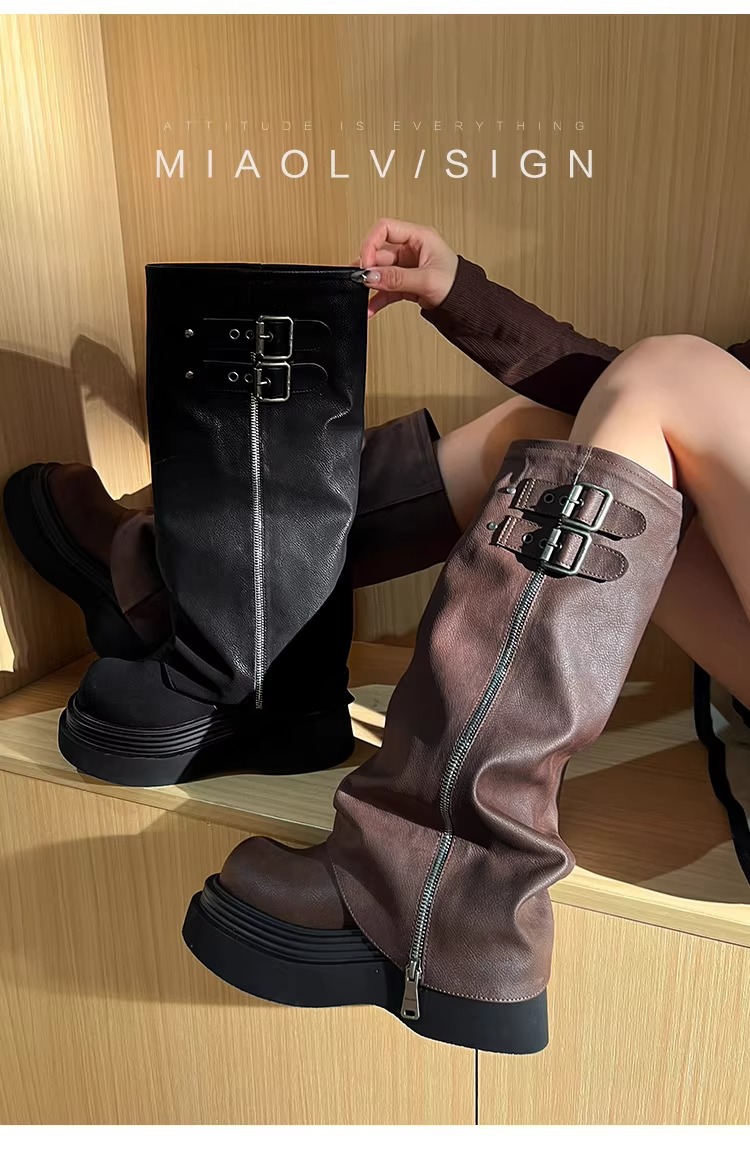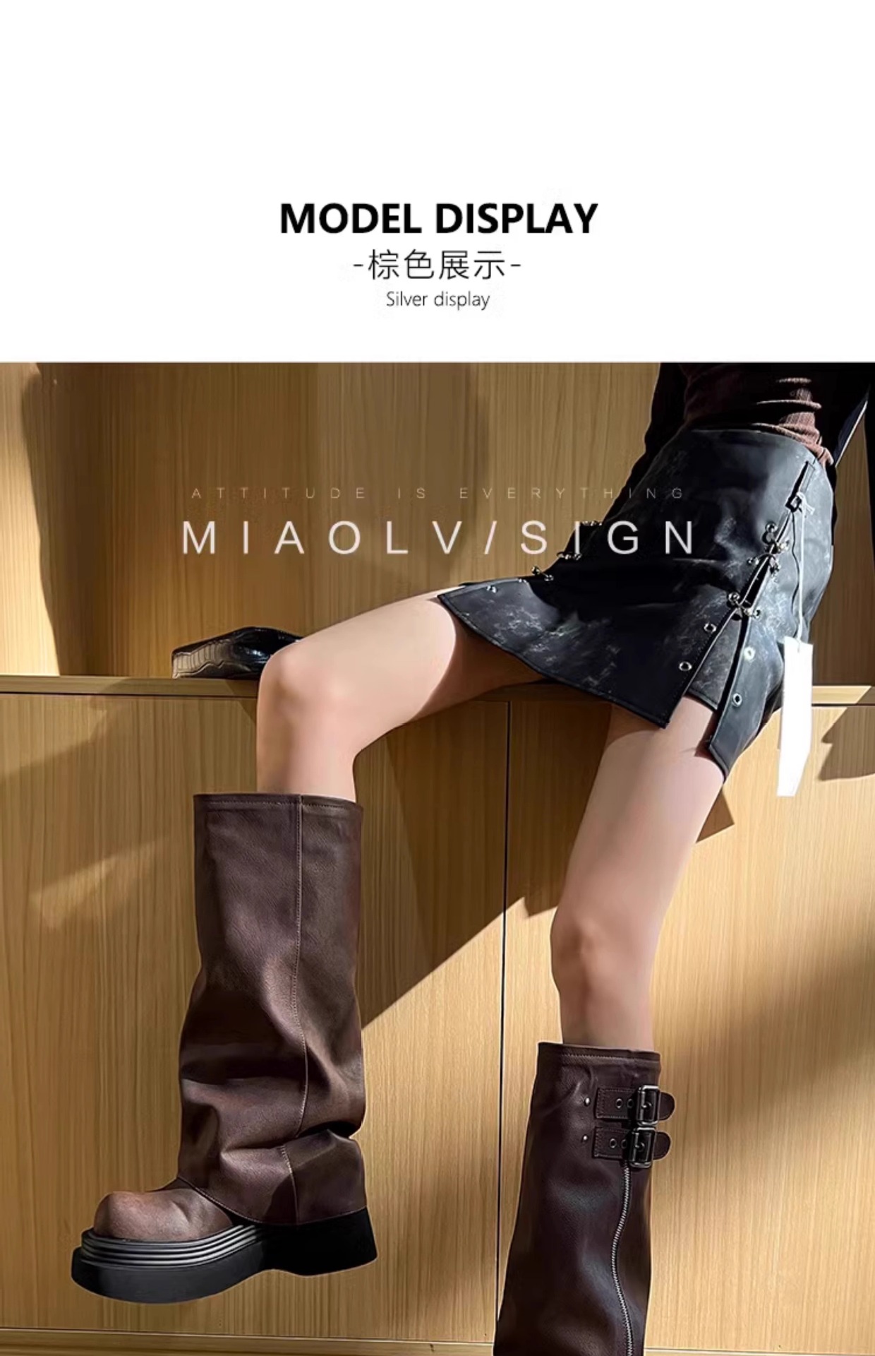 무릎 두께의 굽이 두꺼운 나이트부츠 2025 봄, 가을 두꺼운 다리 부츠 레트로 두꺼운 밑창 주름 바지 부츠 여성용스토어 가기