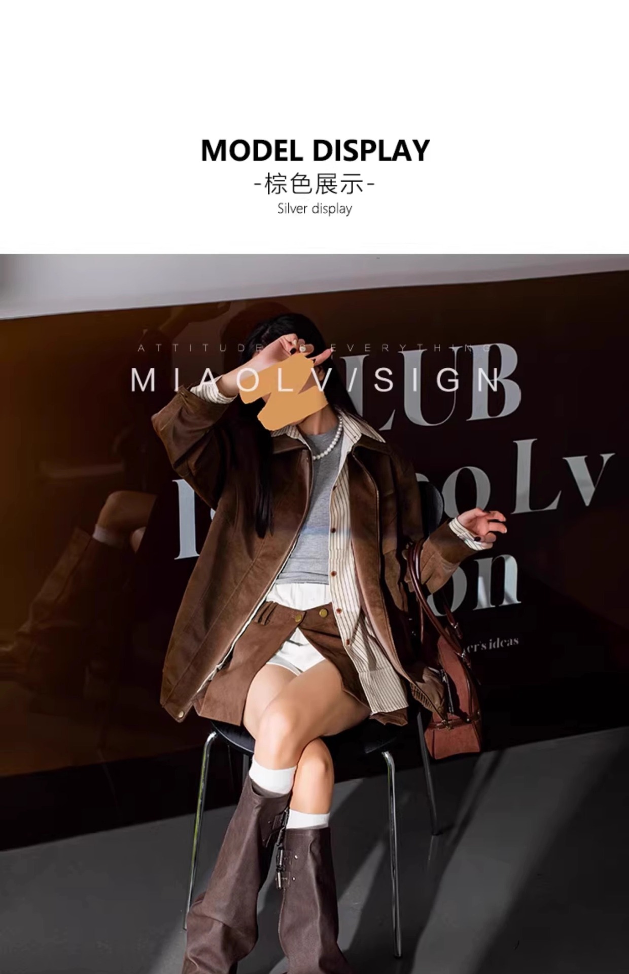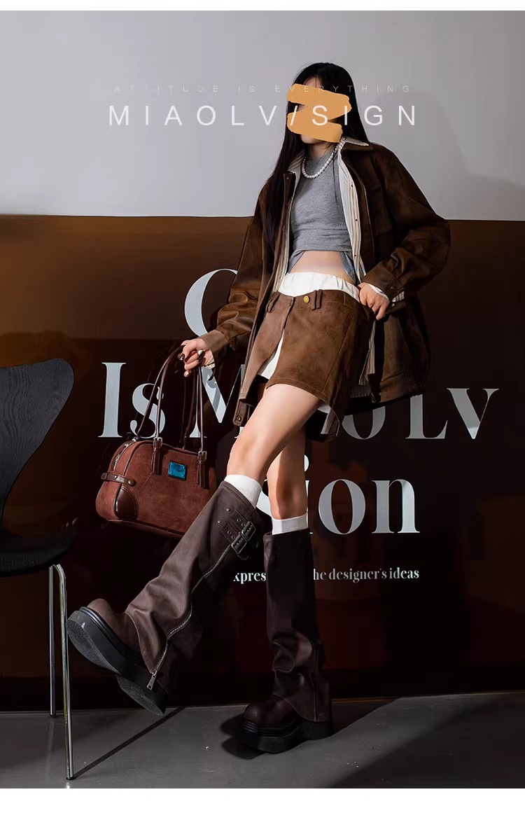 复古褶皱圆头粗跟堆堆靴2025新款秋冬长筒靴卡其色绒面不过膝长靴