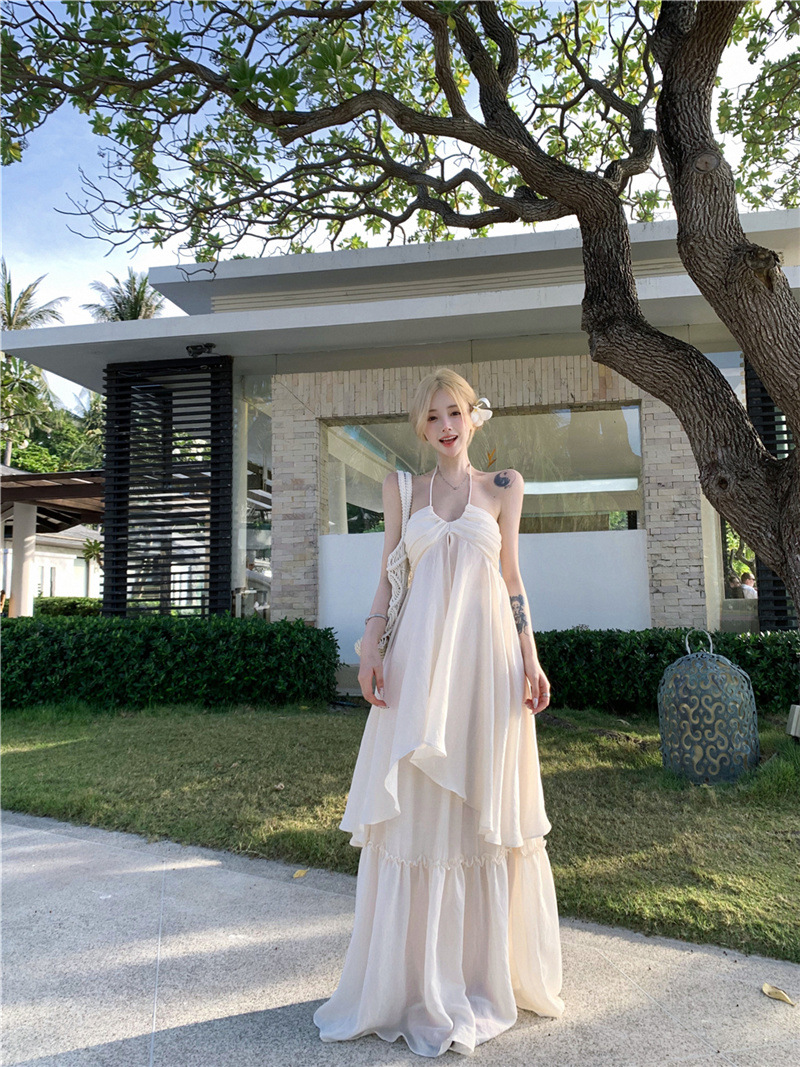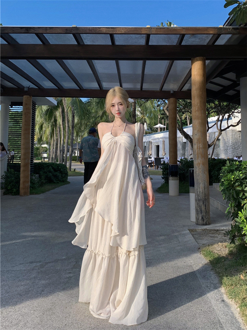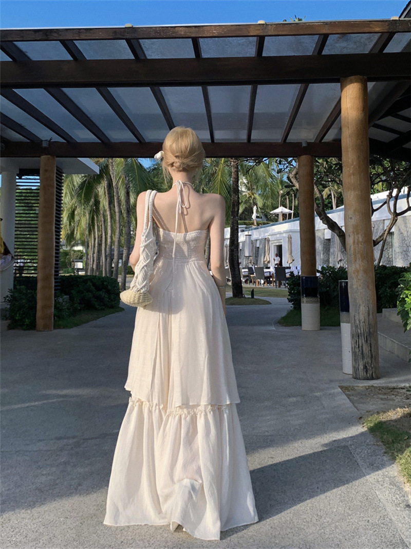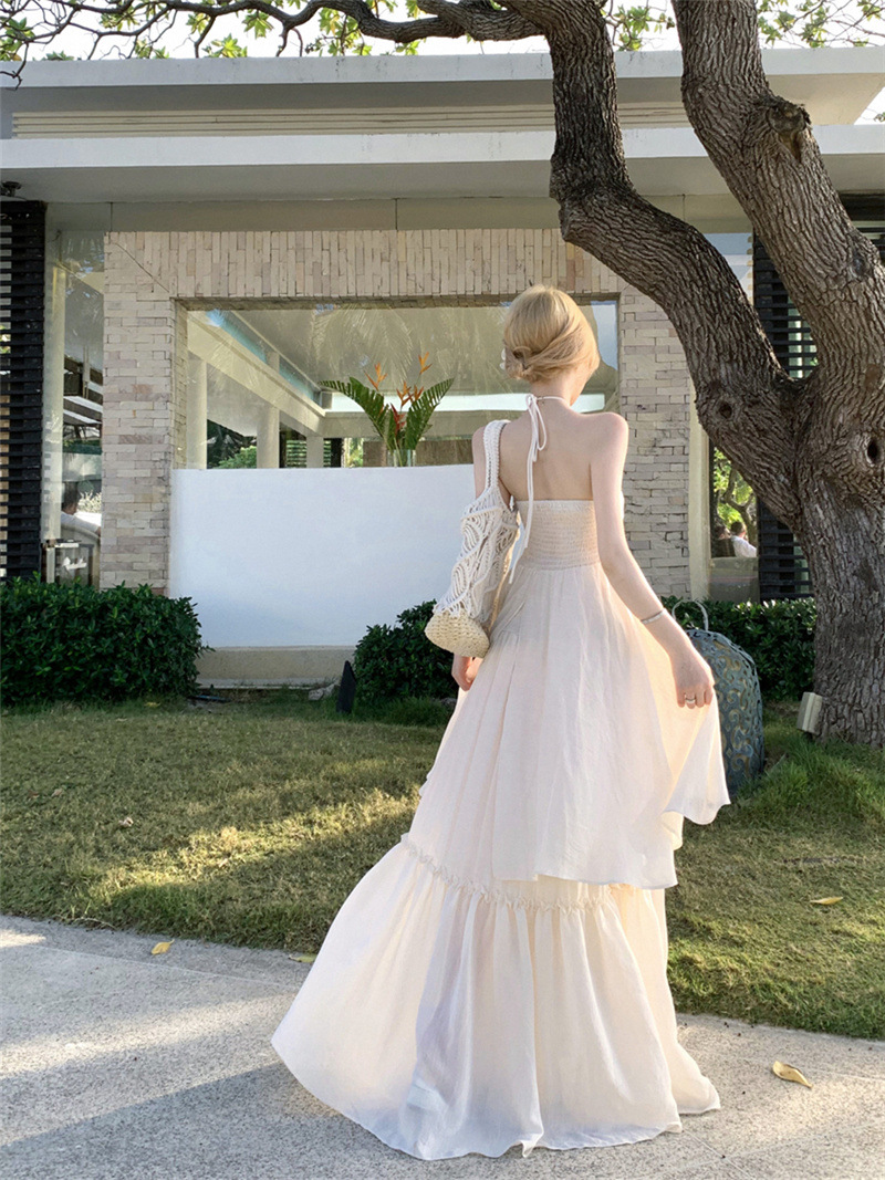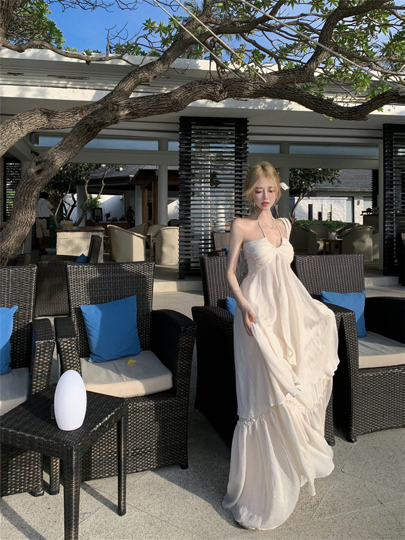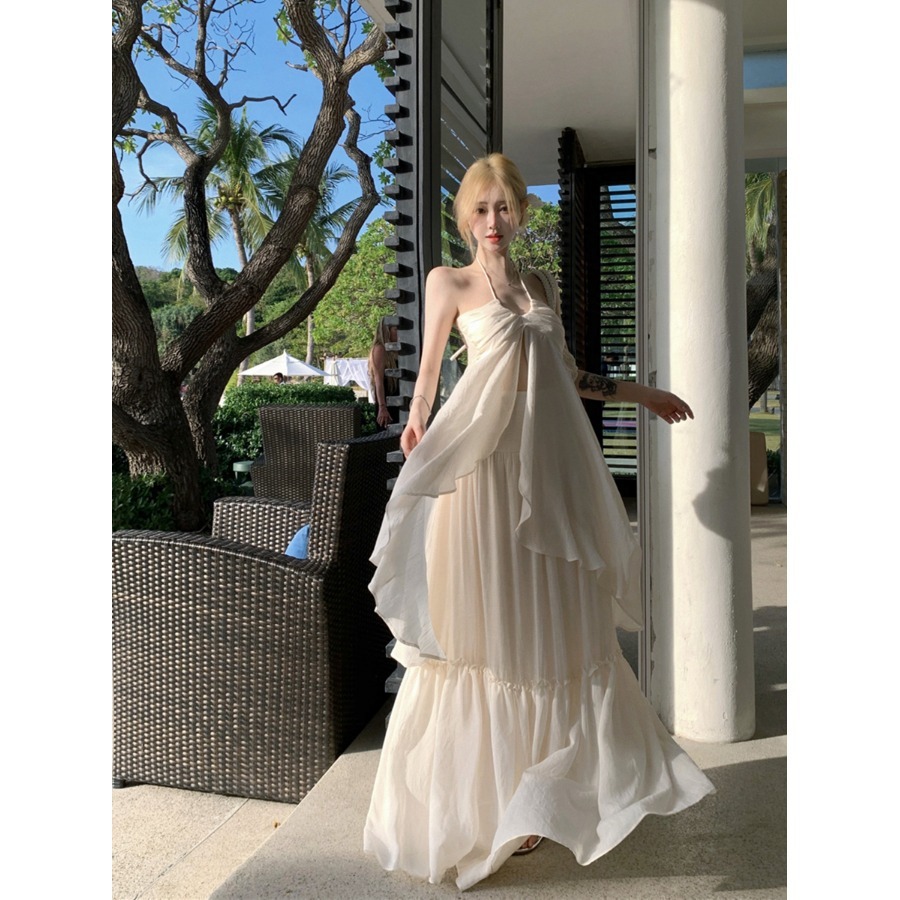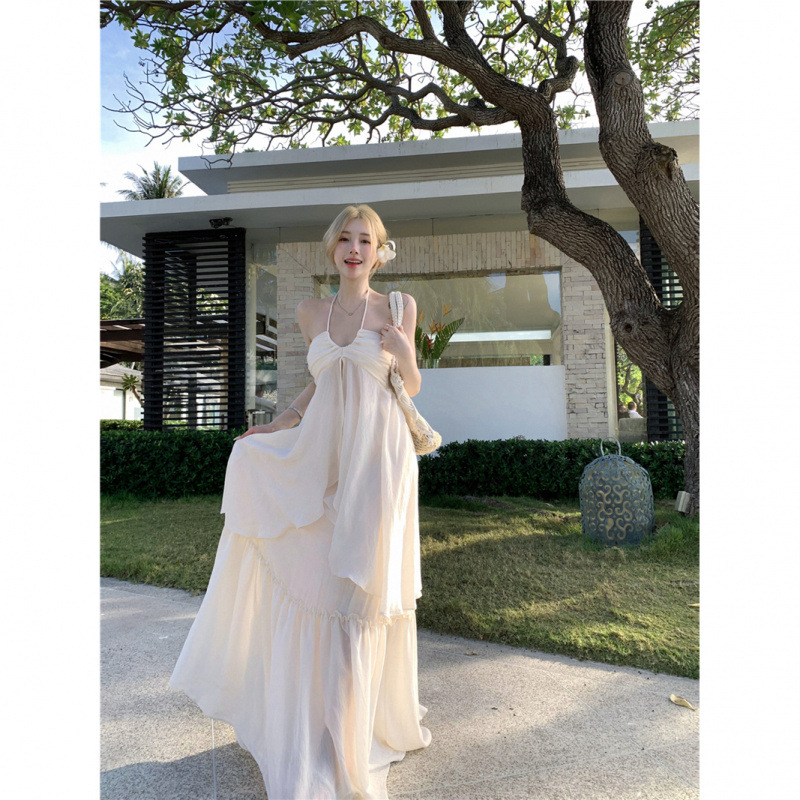 휴가 스타일 슈트 프렌치 슈퍼 요정 백리스 홀터넥 조끼 여성 여름 착용 하이 웨이스트 스커트 롱 스커트 투피스 세트스토어 가기
