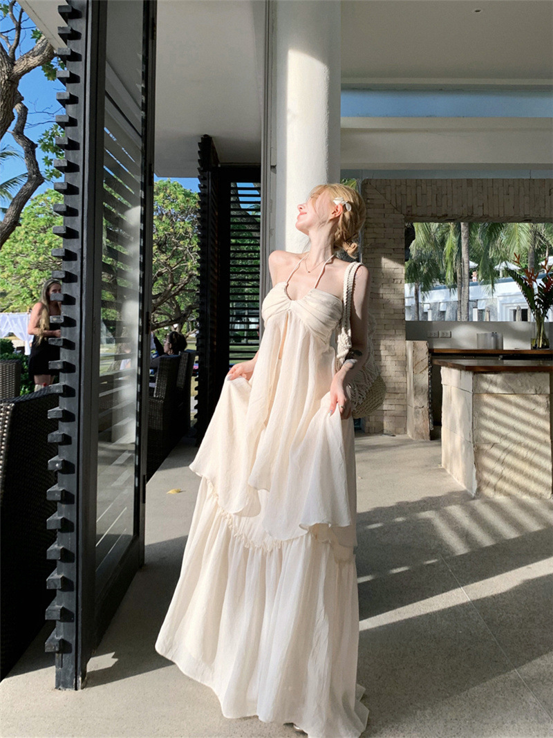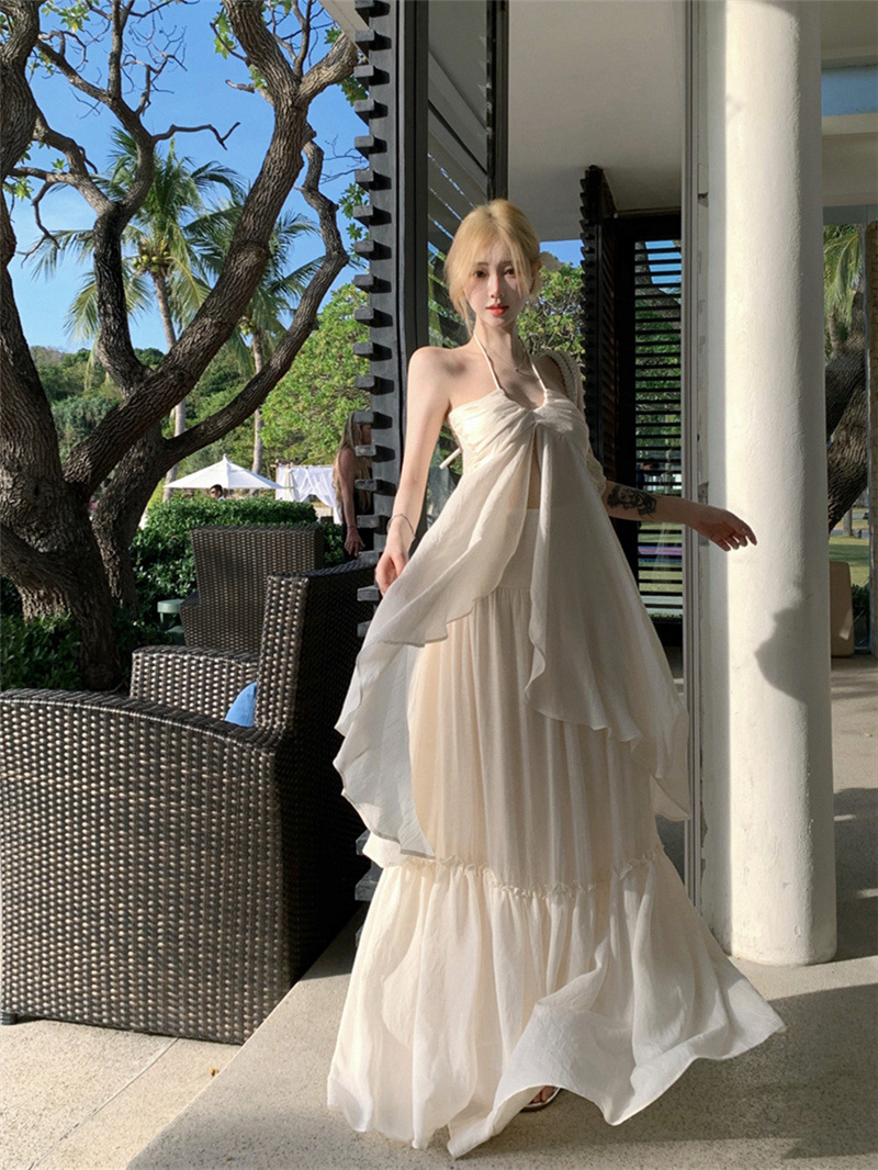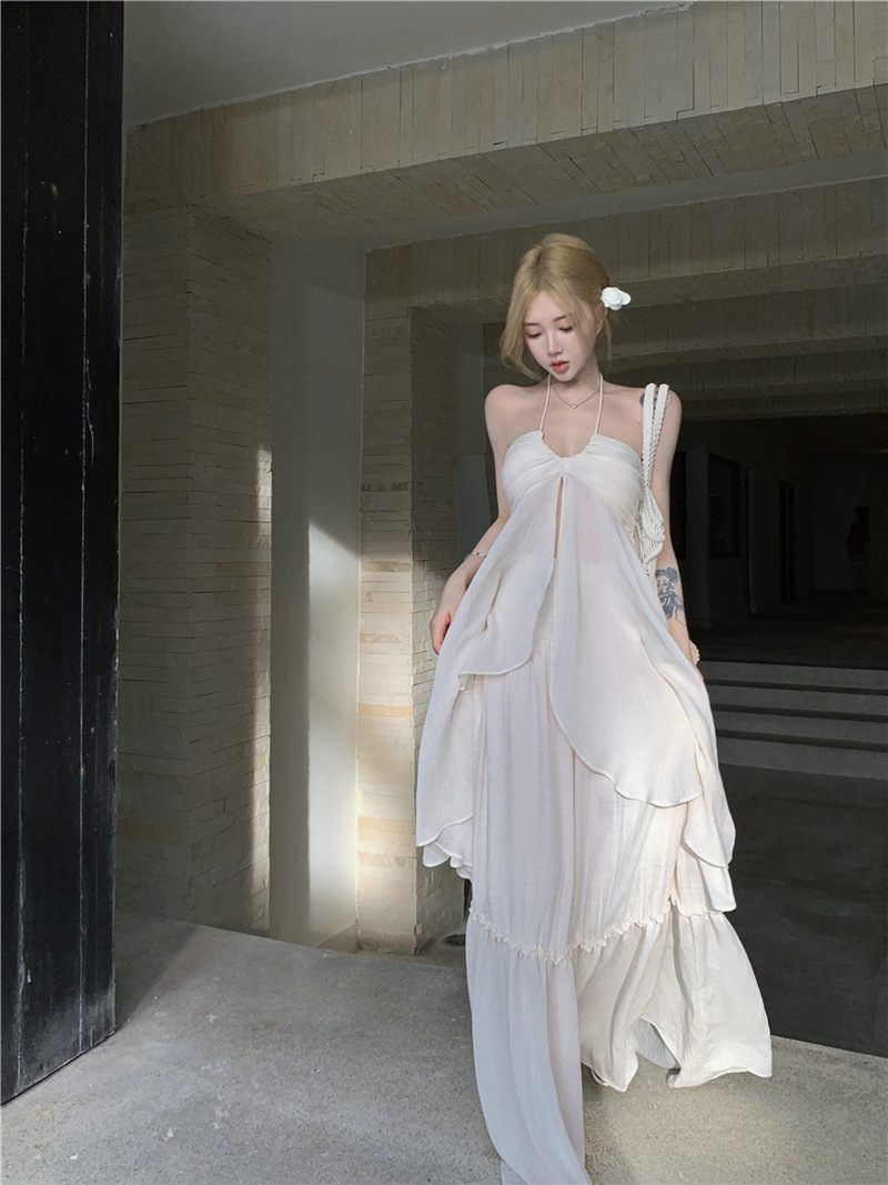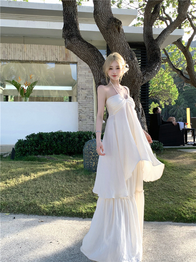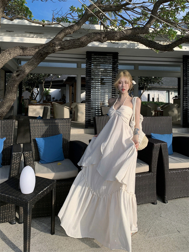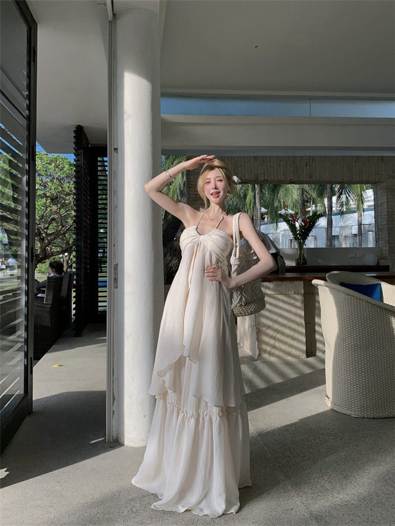 휴가 스타일 슈트 프렌치 슈퍼 요정 백리스 홀터넥 조끼 여성 여름 착용 하이 웨이스트 스커트 롱 스커트 투피스 세트스토어 가기