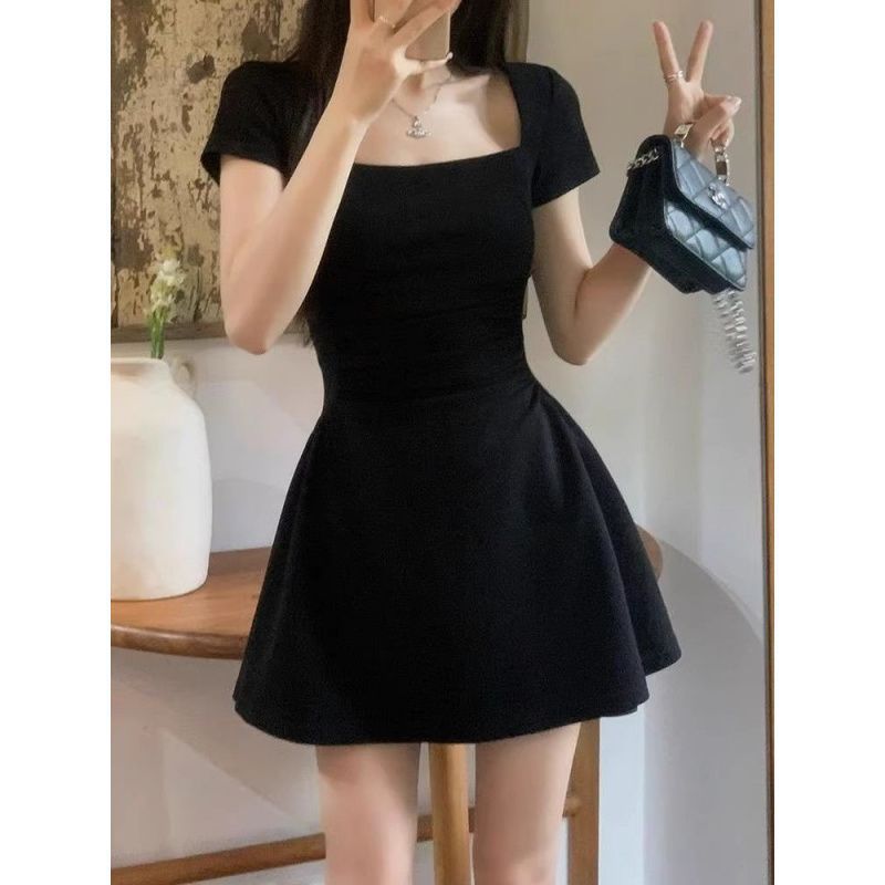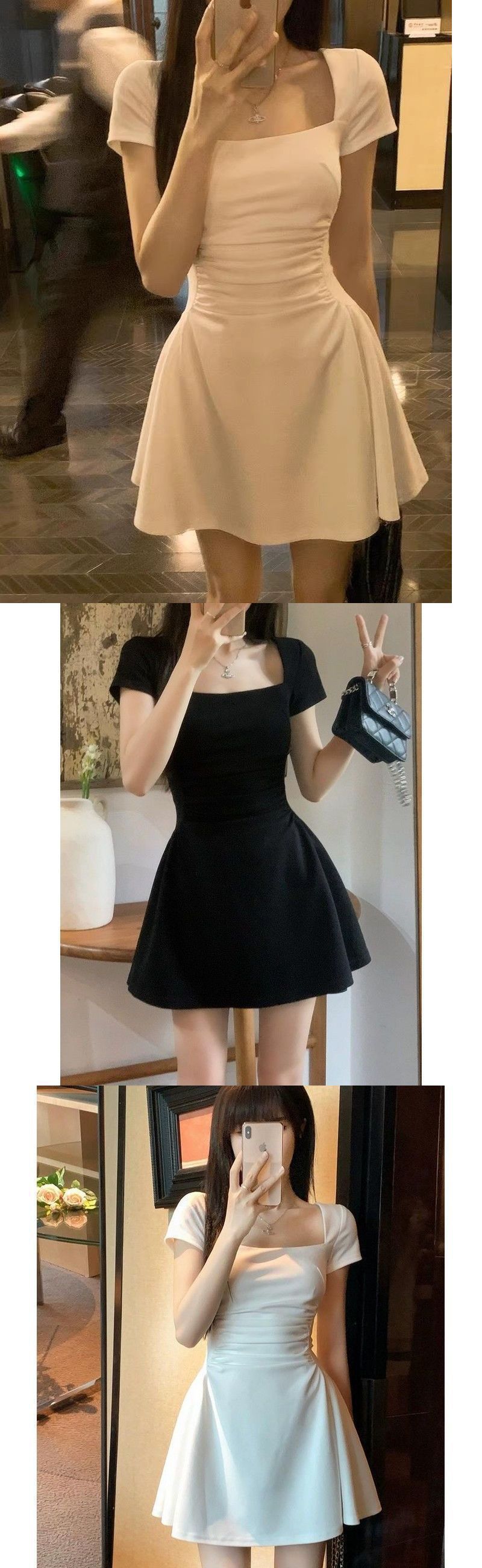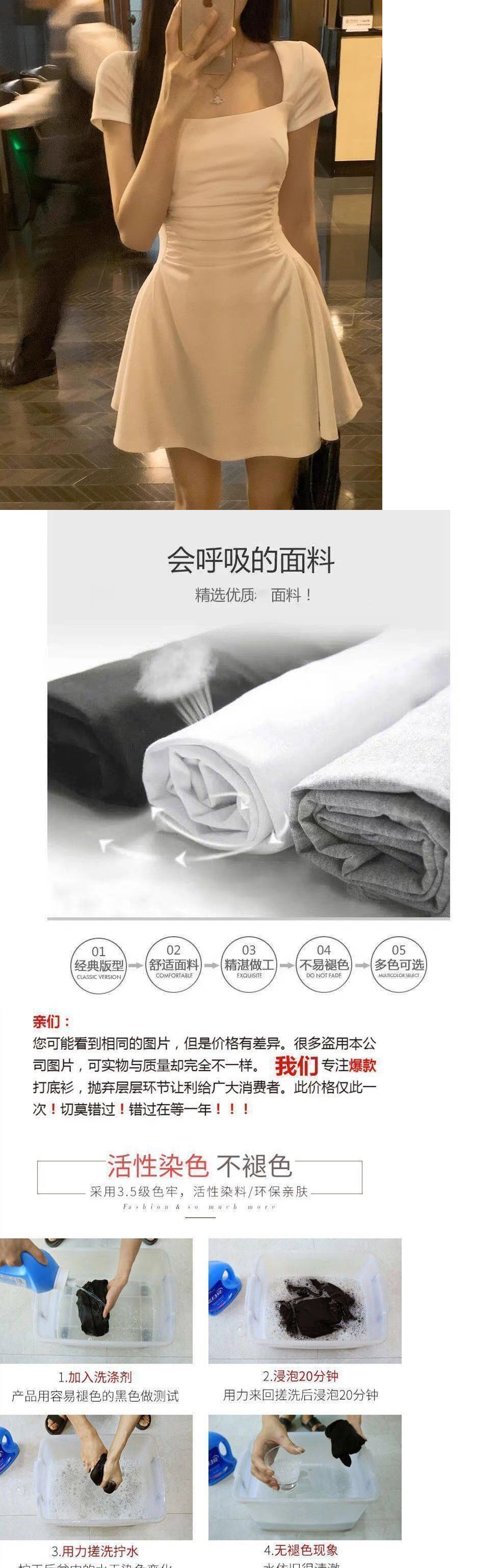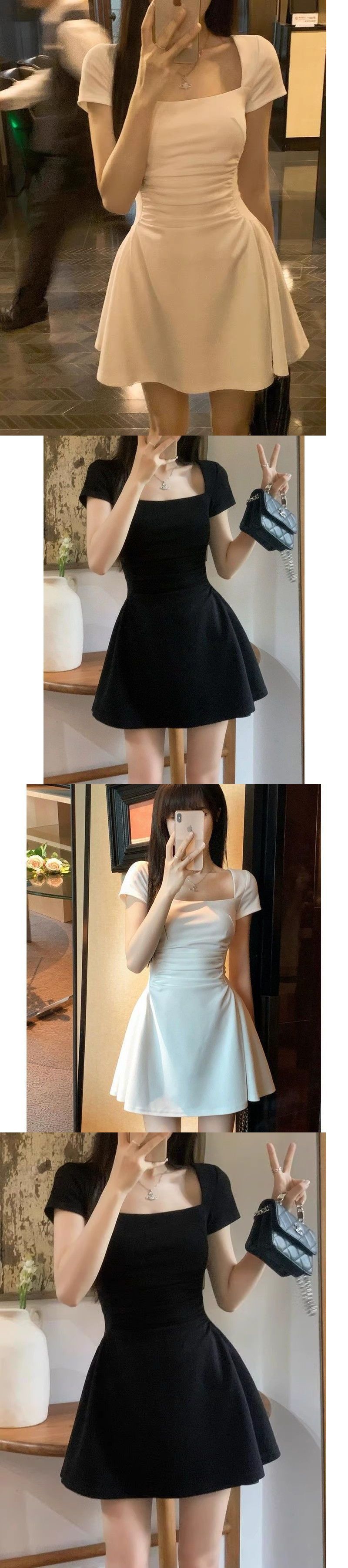 여름 신작 햅번 스타일 스퀘어 칼라 작은 기질 허리 화이트 드레스 슬림핏 짧은 스커트스토어 가기