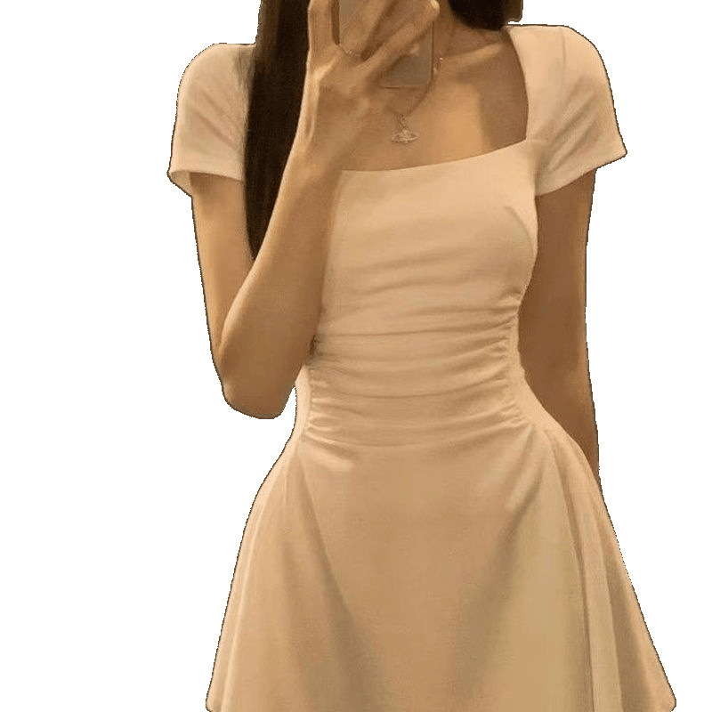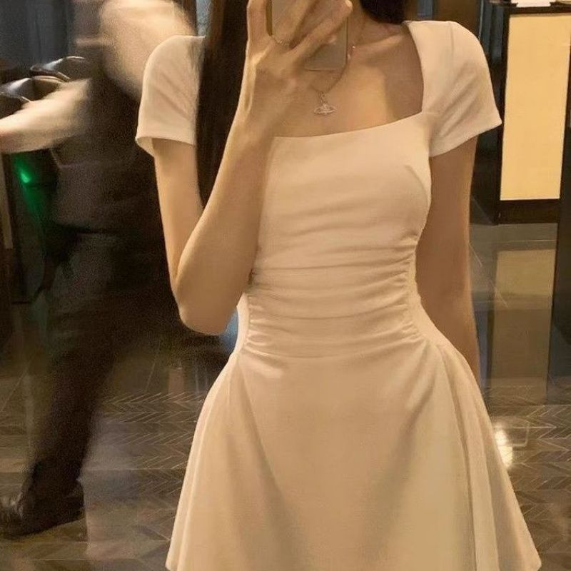 여름 신작 햅번 스타일 스퀘어 칼라 작은 기질 허리 화이트 드레스 슬림핏 짧은 스커트