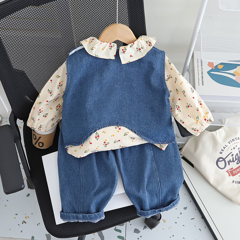 패셔너블한 여아 한국식 데님 슈트 봄 신상 패셔너블 3피스 슈트 공장 도매스토어 가기
