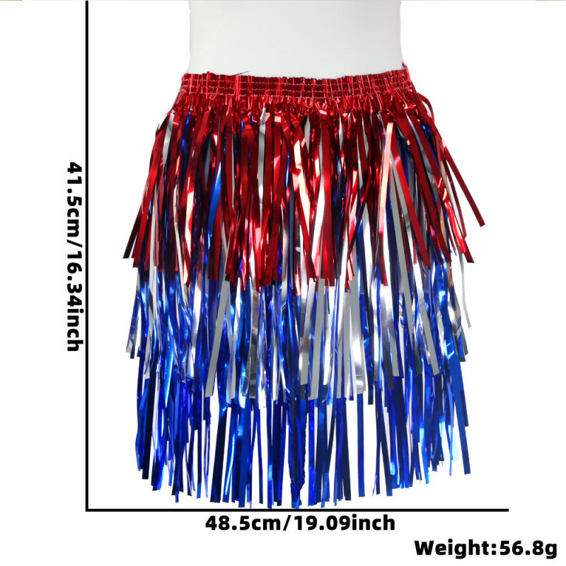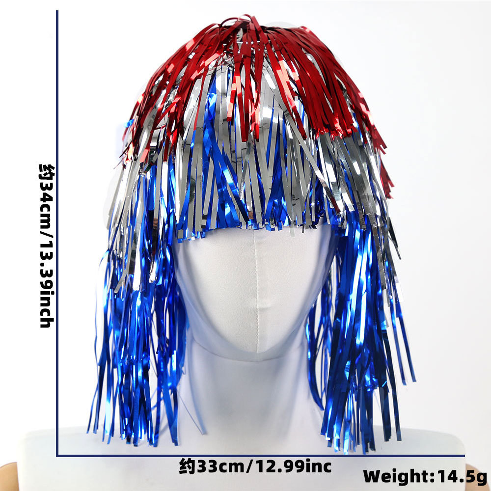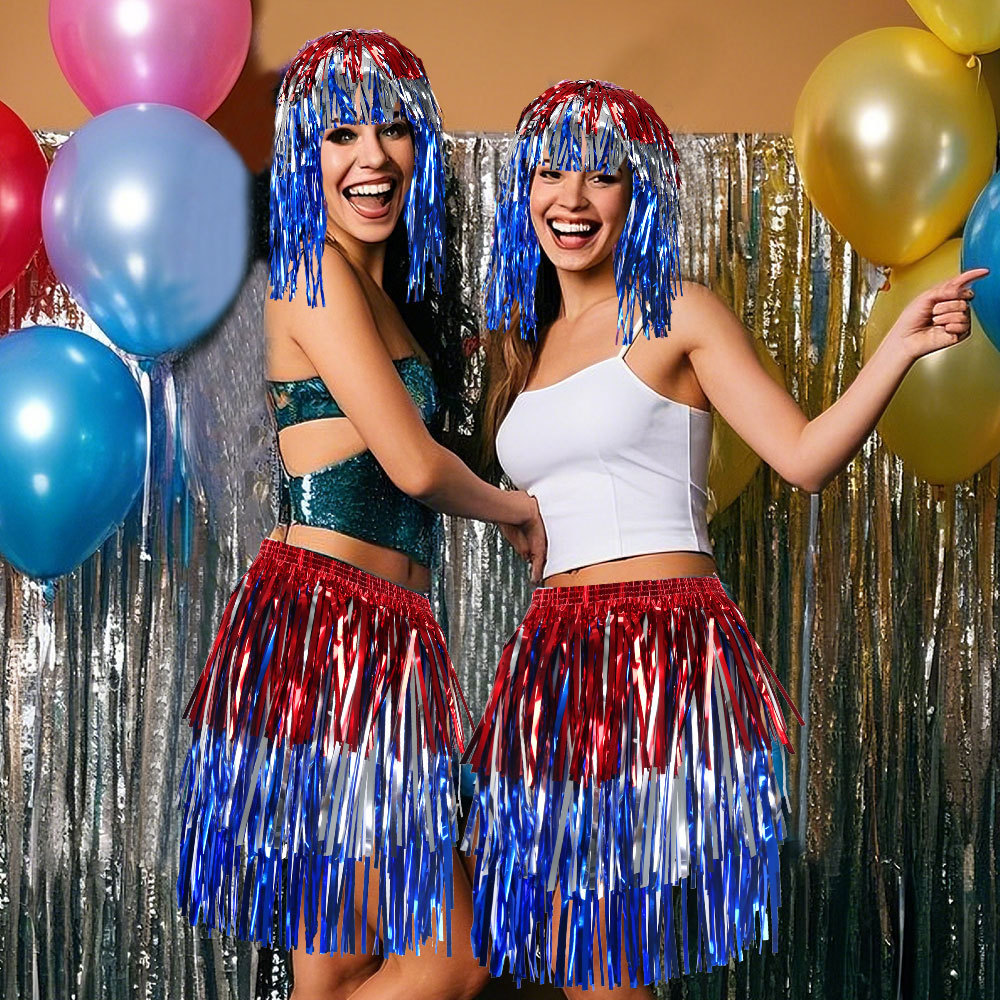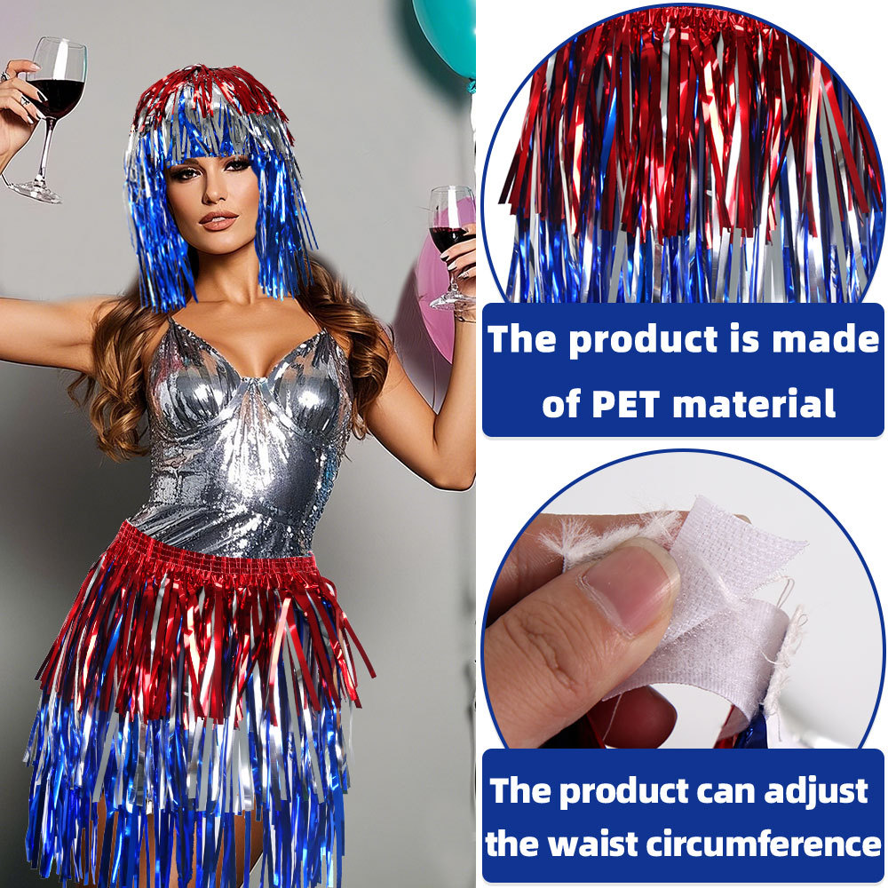 새로운 독립 기념일 파티 의상 빨간색, 은색 및 파란색 비 실크 모자 가발 미국 국경일 퍼레이드 드레스 컬러 매칭 비 실크 스커트스토어 가기