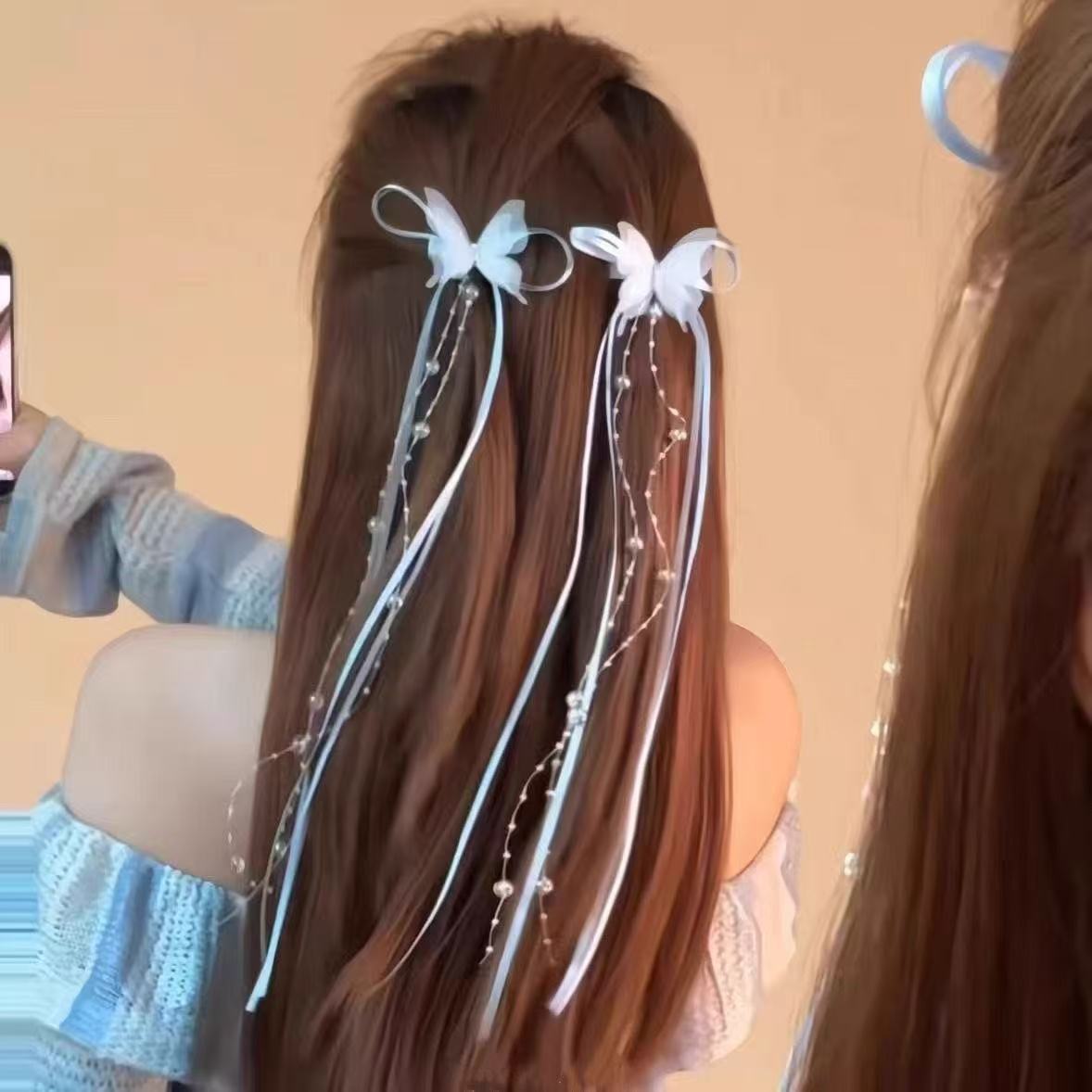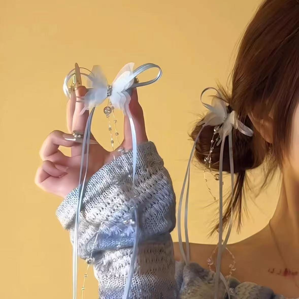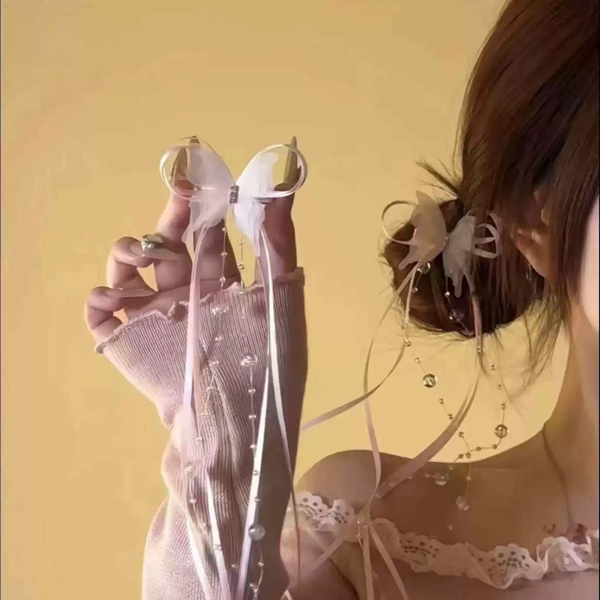 판타지 발레 ~ 프렌치 레트로 리본 비즈 롱 태슬 나비 머리핀 여성 발레 스타일 스위트 클립 헤어 액세서리