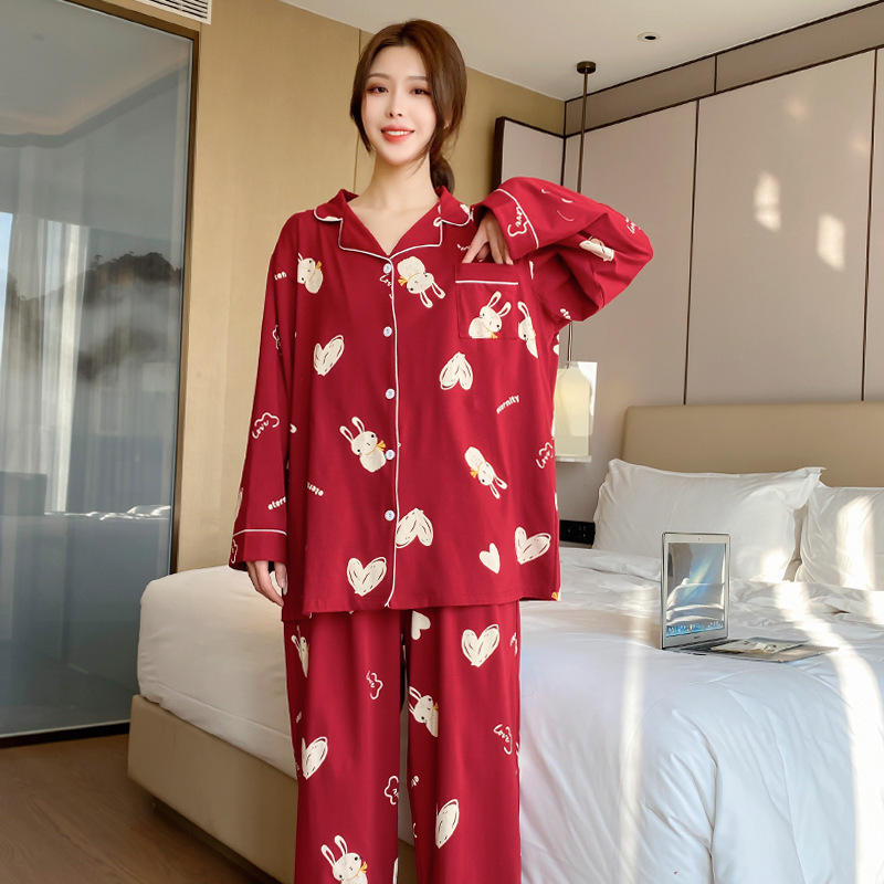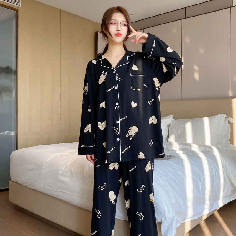 봄과 가을 플러스 사이즈 잠옷 숙녀 홈웨어 140kg Fat M 옷깃 코튼 긴 소매 만화 프린트 투피스 세트스토어 가기