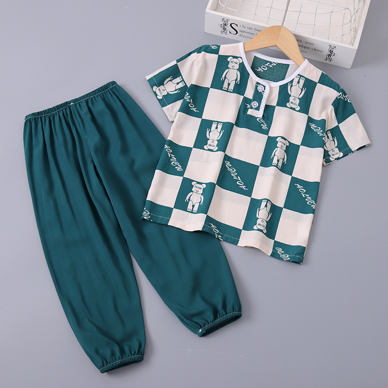 소년과 소녀를위한 여름 어린이 면화 실크 잠옷 아기 반팔 얇은 면화 실크 에어컨 옷 소년 가정 의류 세트