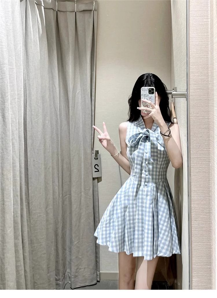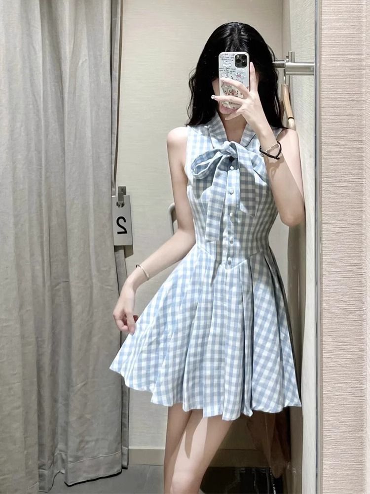 여성을위한 프렌치 스위트 블루 민소매 격자 무늬 드레스 여름 2025 새로운 스타일 보우 기질 주름 짧은 치마스토어 가기