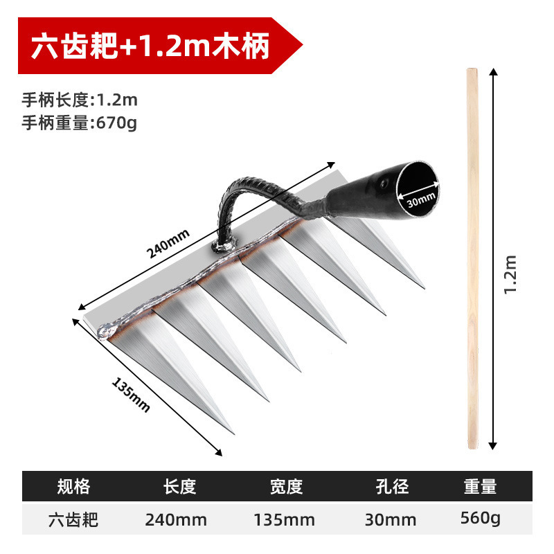 • 완전히 용접된 6개 톱니 괭이(갈퀴) + 1.2m 메뚜기 나무 손잡이
