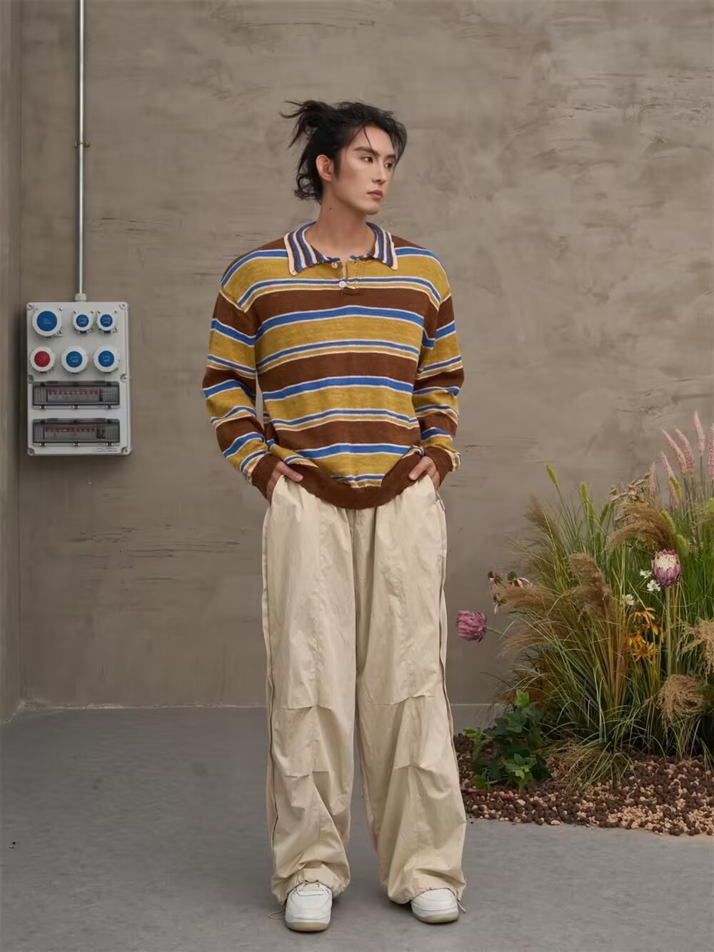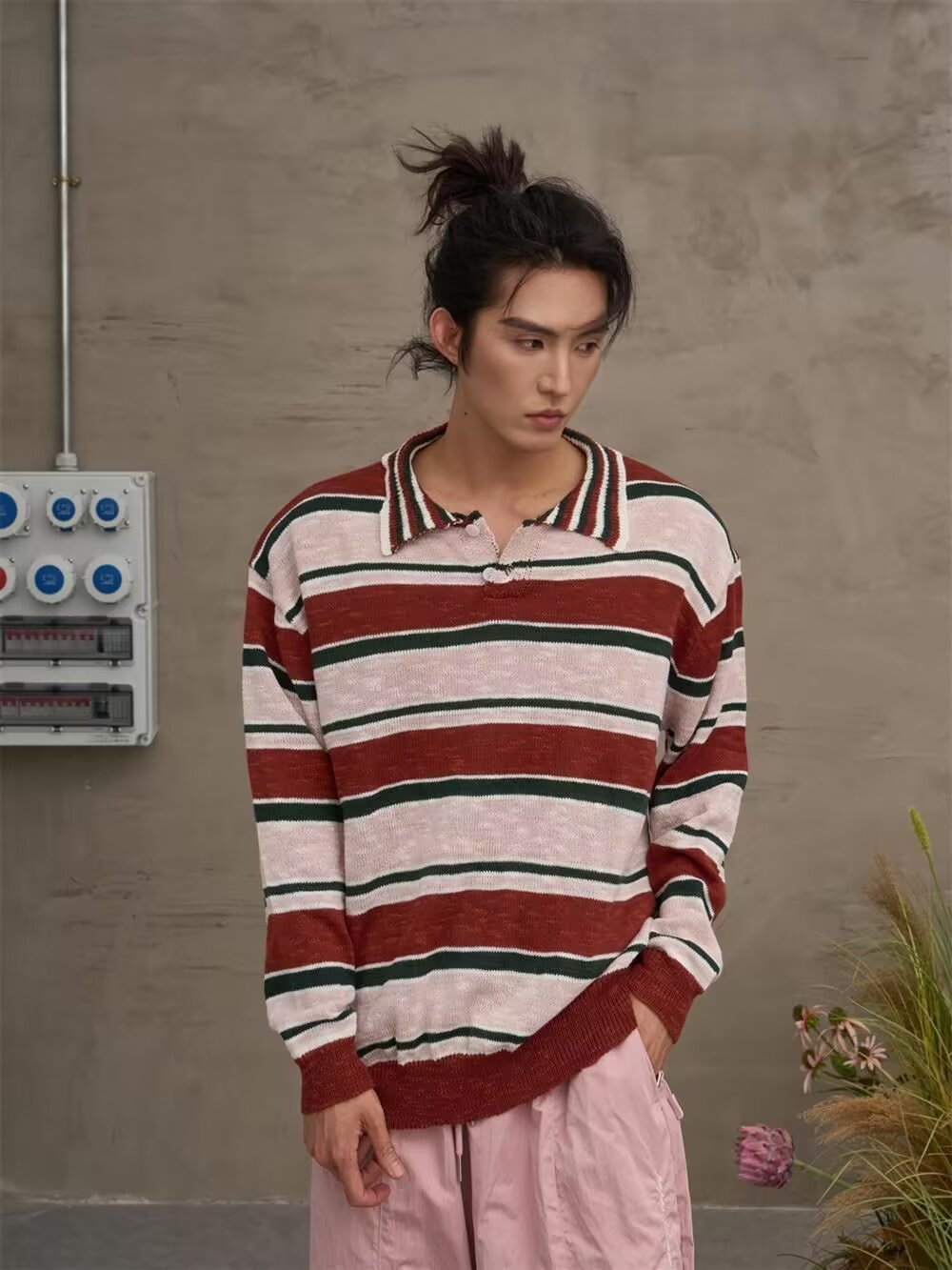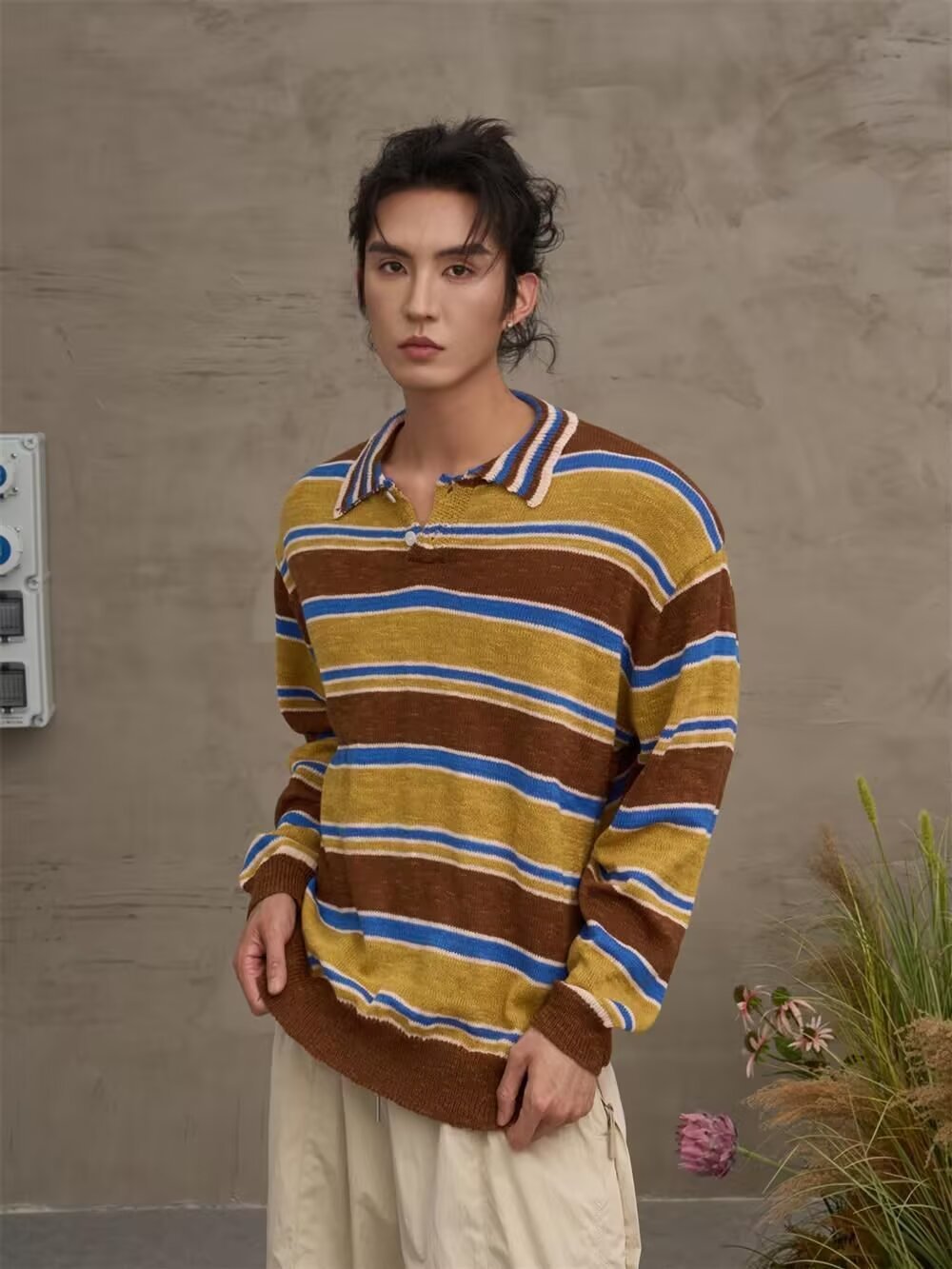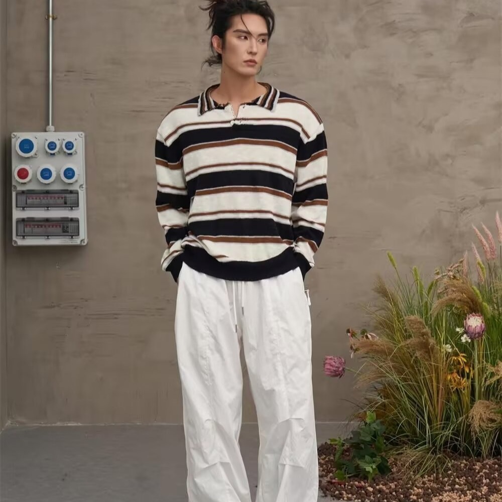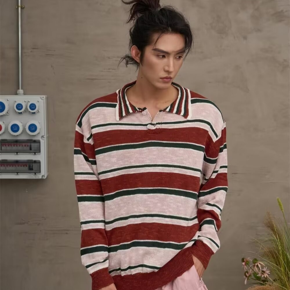 아메리칸 레트로 폴로 셔츠 대비 스트라이프 니트 스웨터 남성 가을, 겨울 트렌디 루즈 레이지 얇은 울 탑