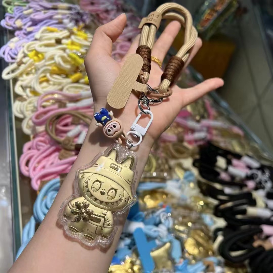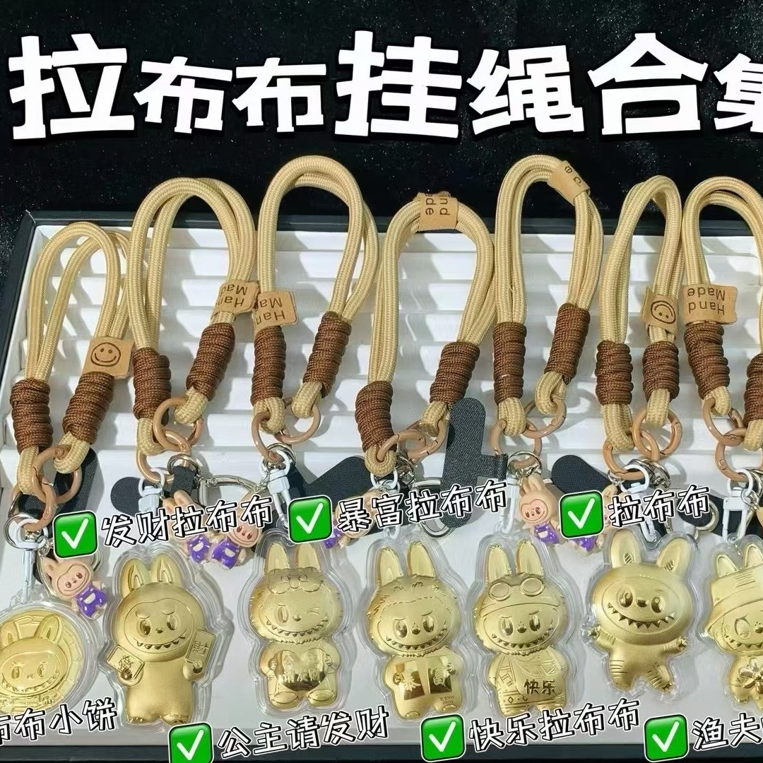Bubble Mart 순수 골드 labubu labubu 만화 휴대 전화 체인 로프 키 체인 행운과 축복 가방 펜던트 선물