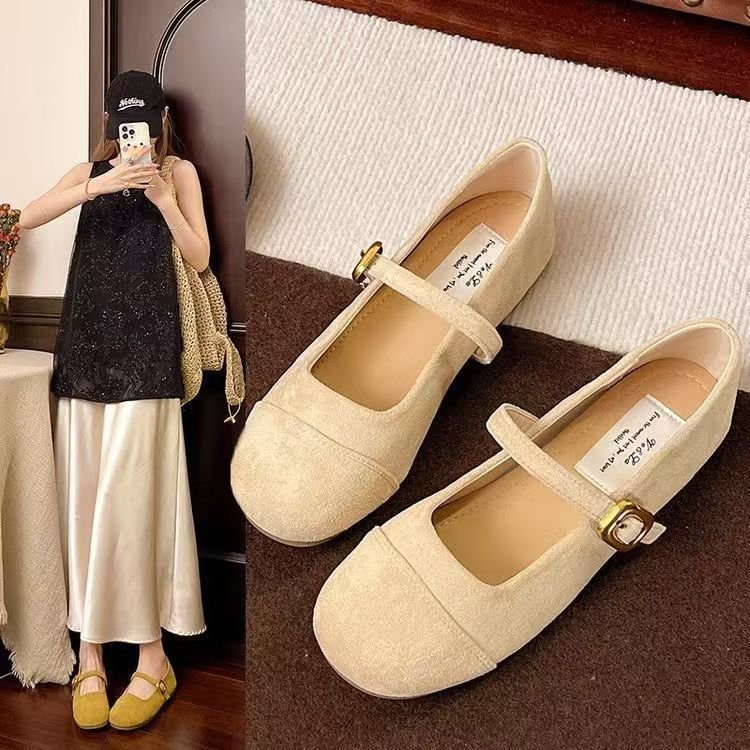 여성을위한 프랑스 스웨이드 메리 제인 신발 2025 여름 새로운 스타일 복고풍 부드러운 바닥 스커트 라운드 발가락 플랫 슬립 온 신발