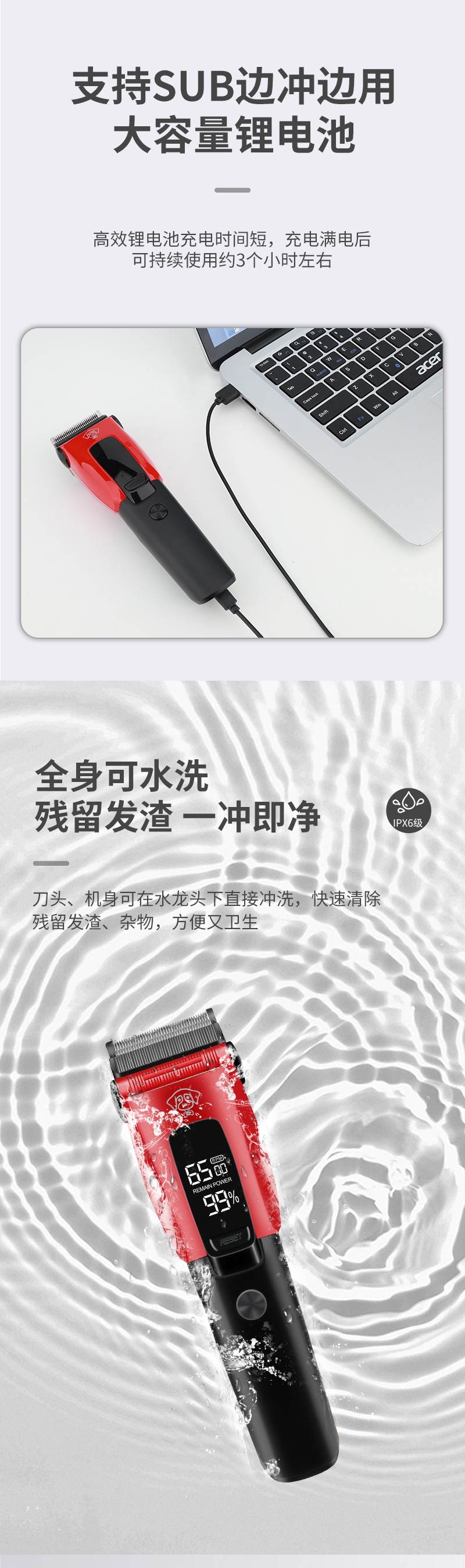 产品配件:主机+USB充电线+限位梳*6(3/6/9/1216/19cm)+清洁刷+英文说明书+梳子+油瓶;