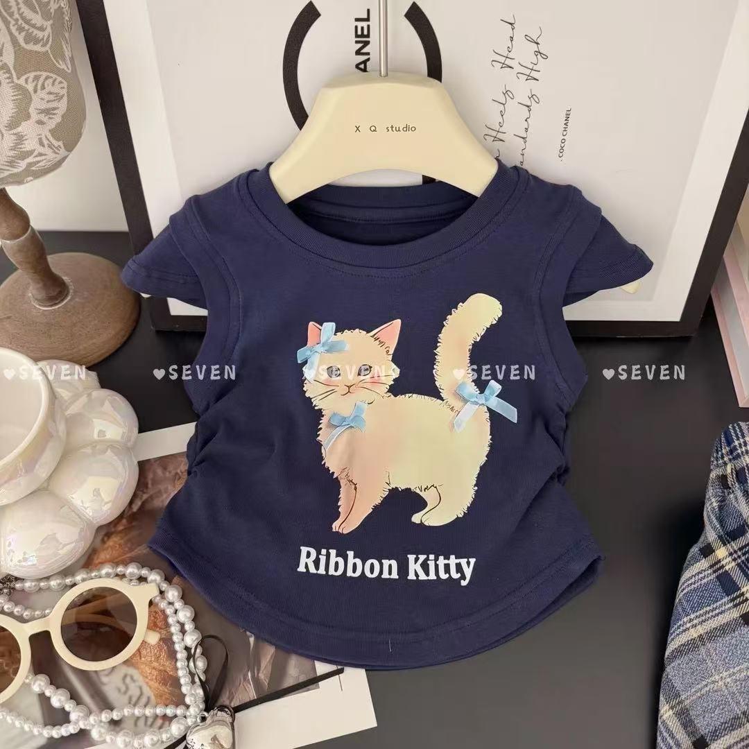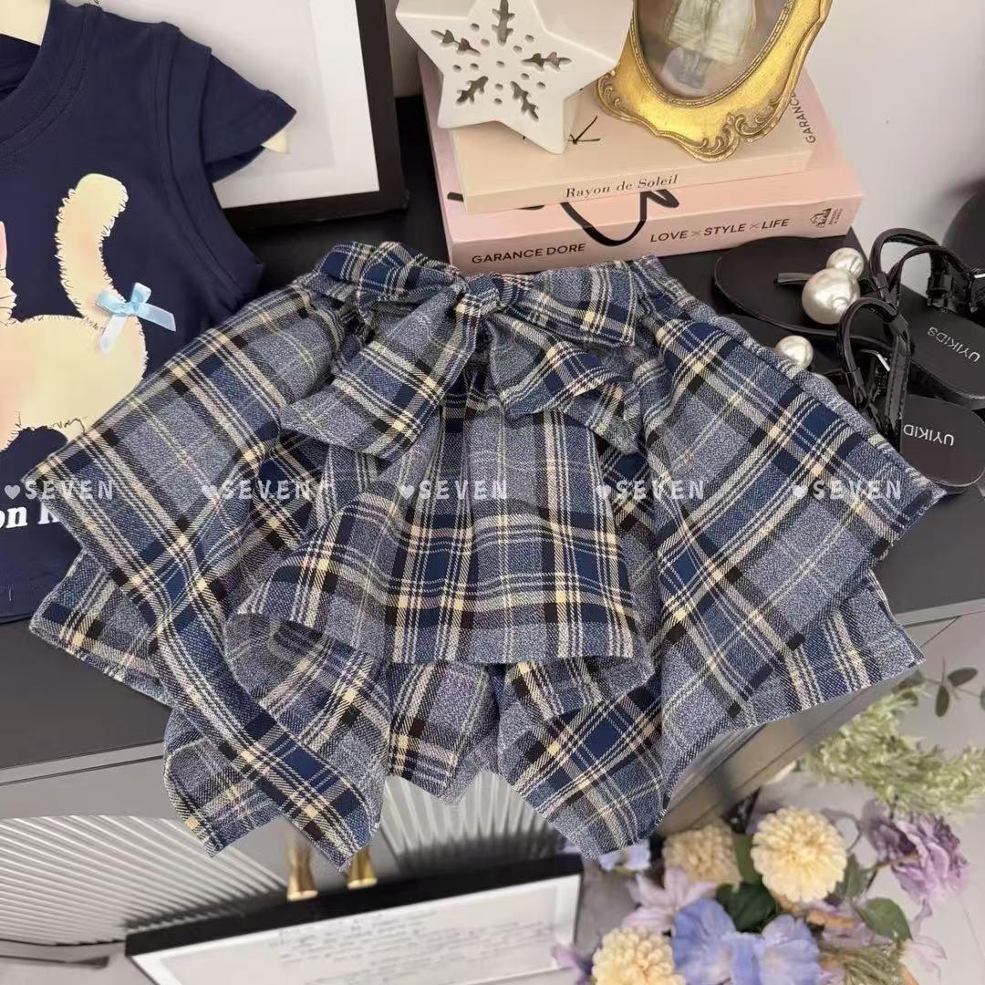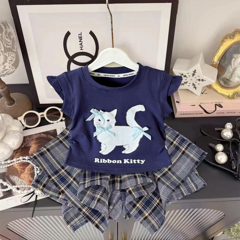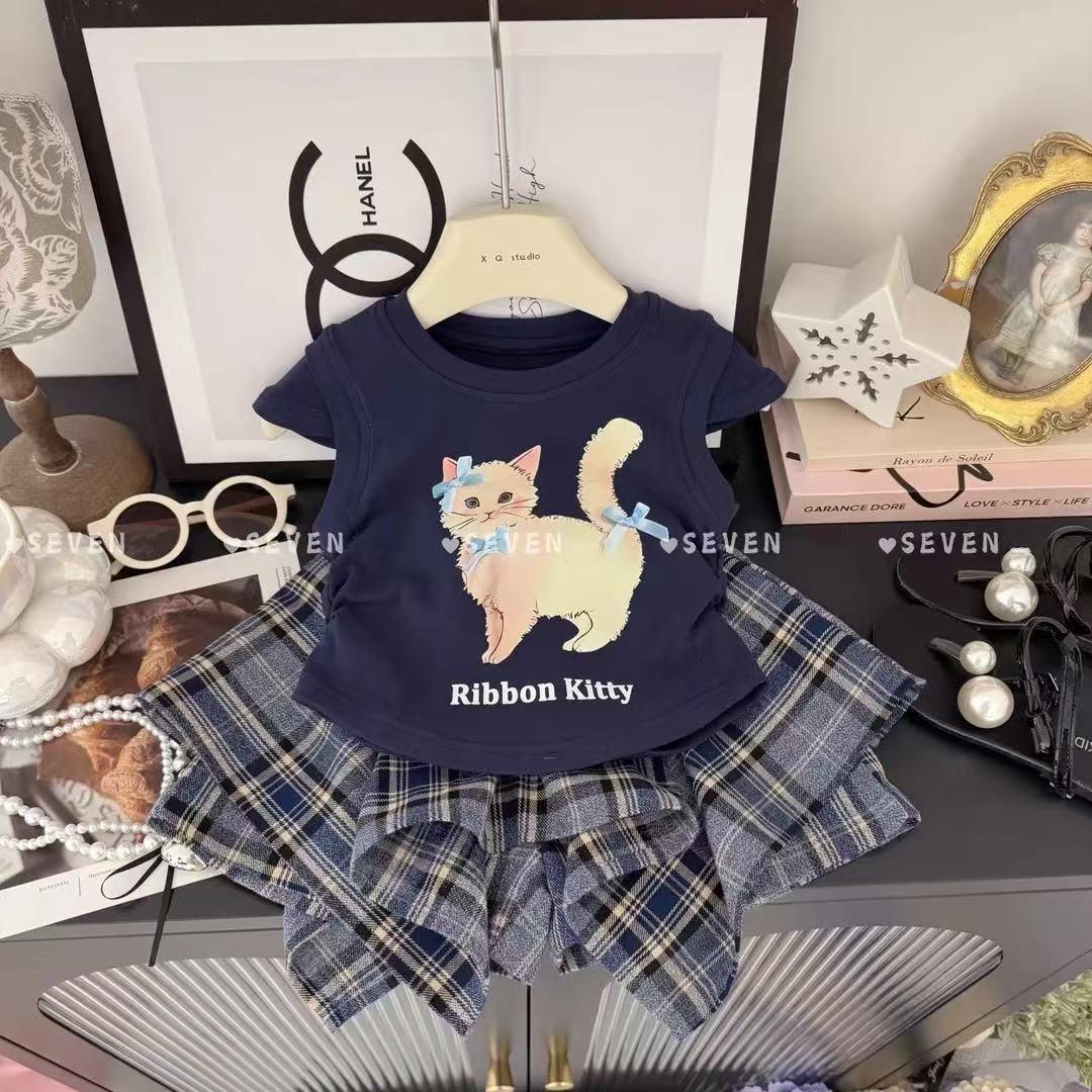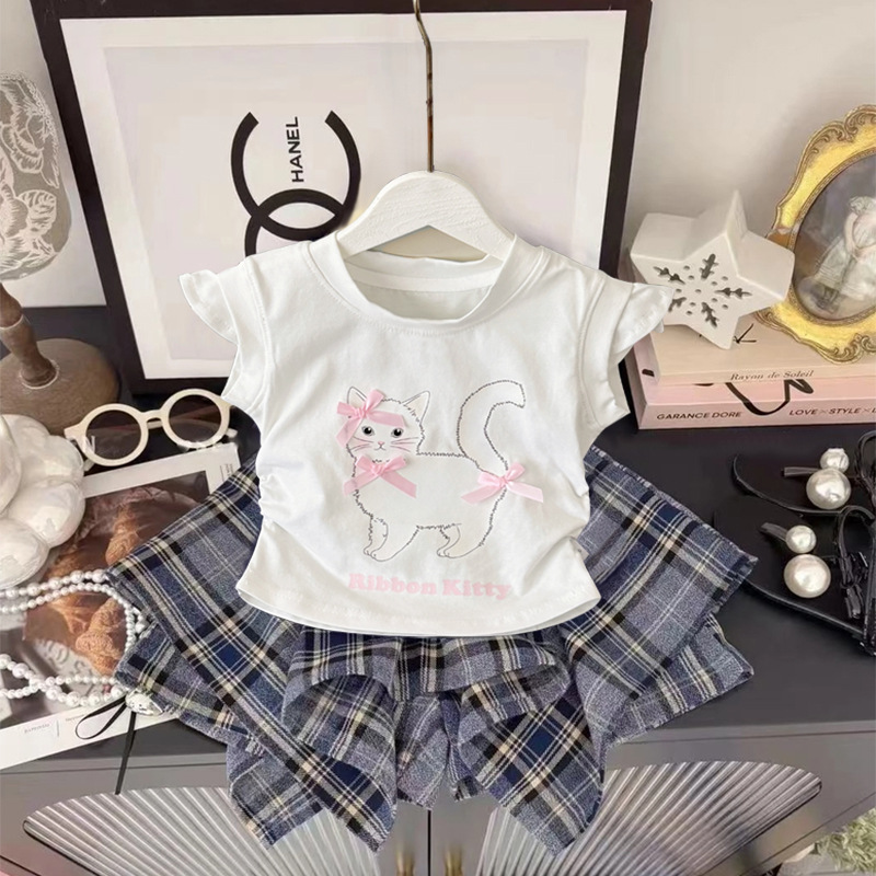 2025 새로운 어린이 만화 티셔츠 조끼 불규칙한 격자 무늬 치마 바지 투피스 세트 소녀 여름 반팔 양복스토어 가기