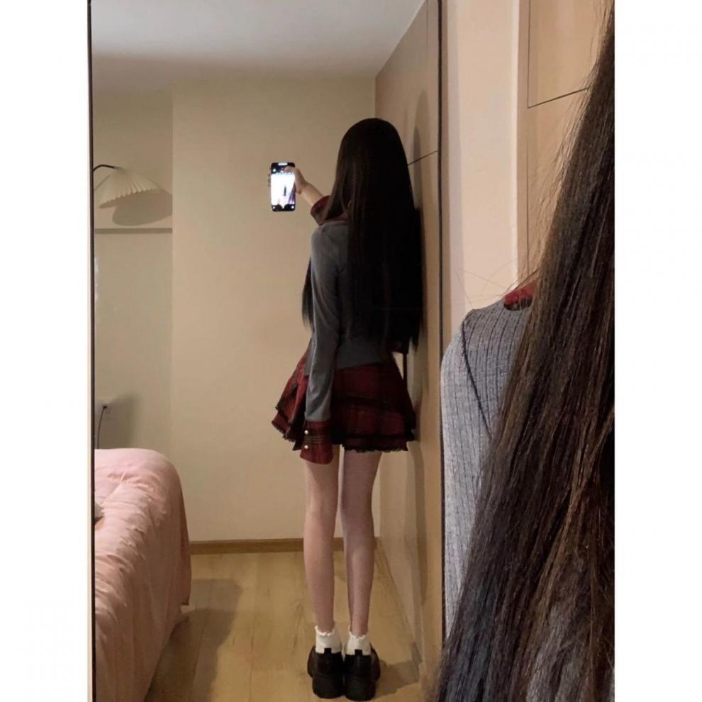 • 그레이와 레드 (단품 - 그레이와 레드 체크무늬 리본 긴팔탑)
