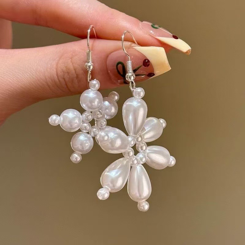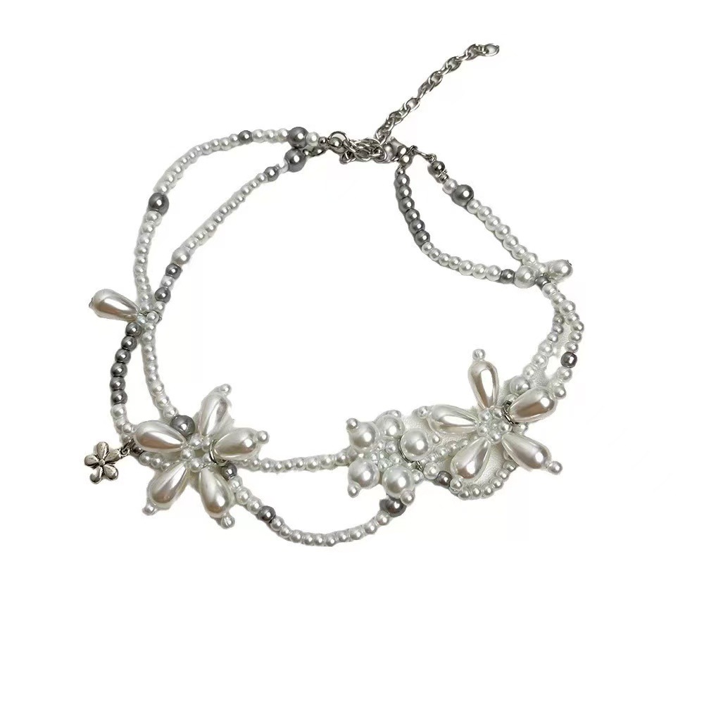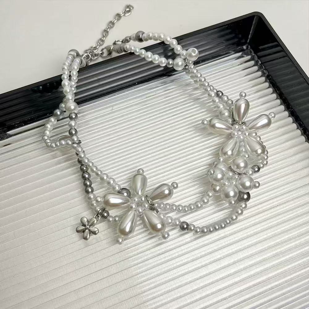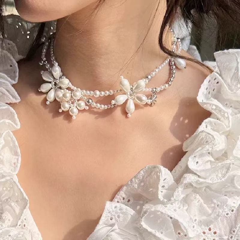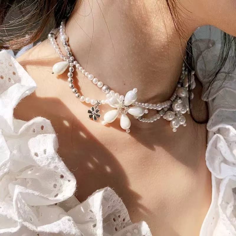 니치한 하이엔드 디자인의 입체적인 진주꽃 목걸이, 핸드메이드 비즈 꽃잎, 더블 레이어 쌓인 쇄골 체인 목걸이
