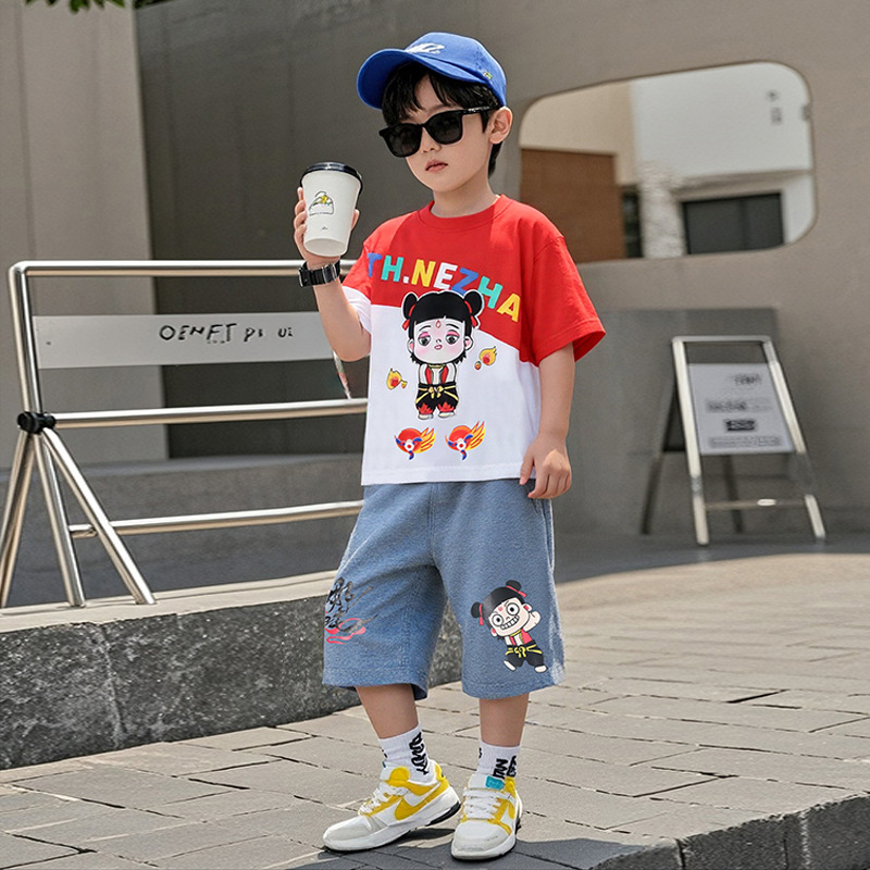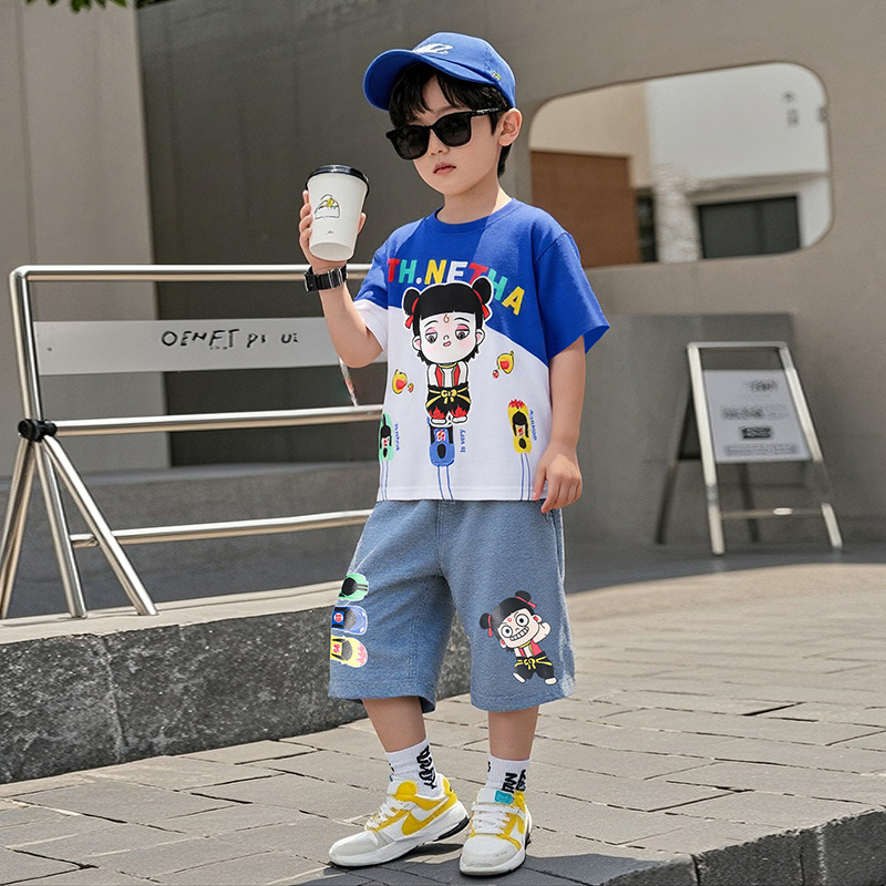 Nezha 조명 세트 2025 여름 새로운 스타일 얇은 어린이 티셔츠 데님 반바지 투피스 세트 소년 유행스토어 가기